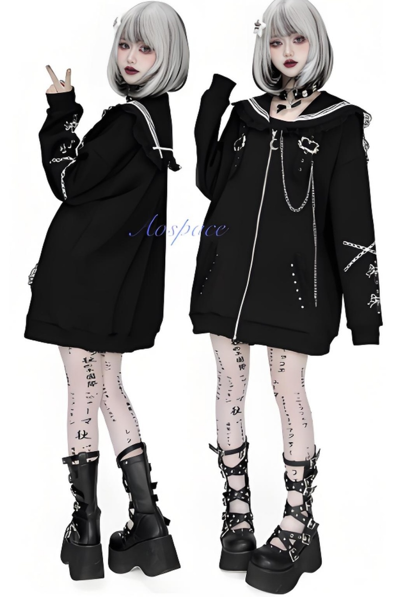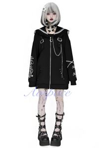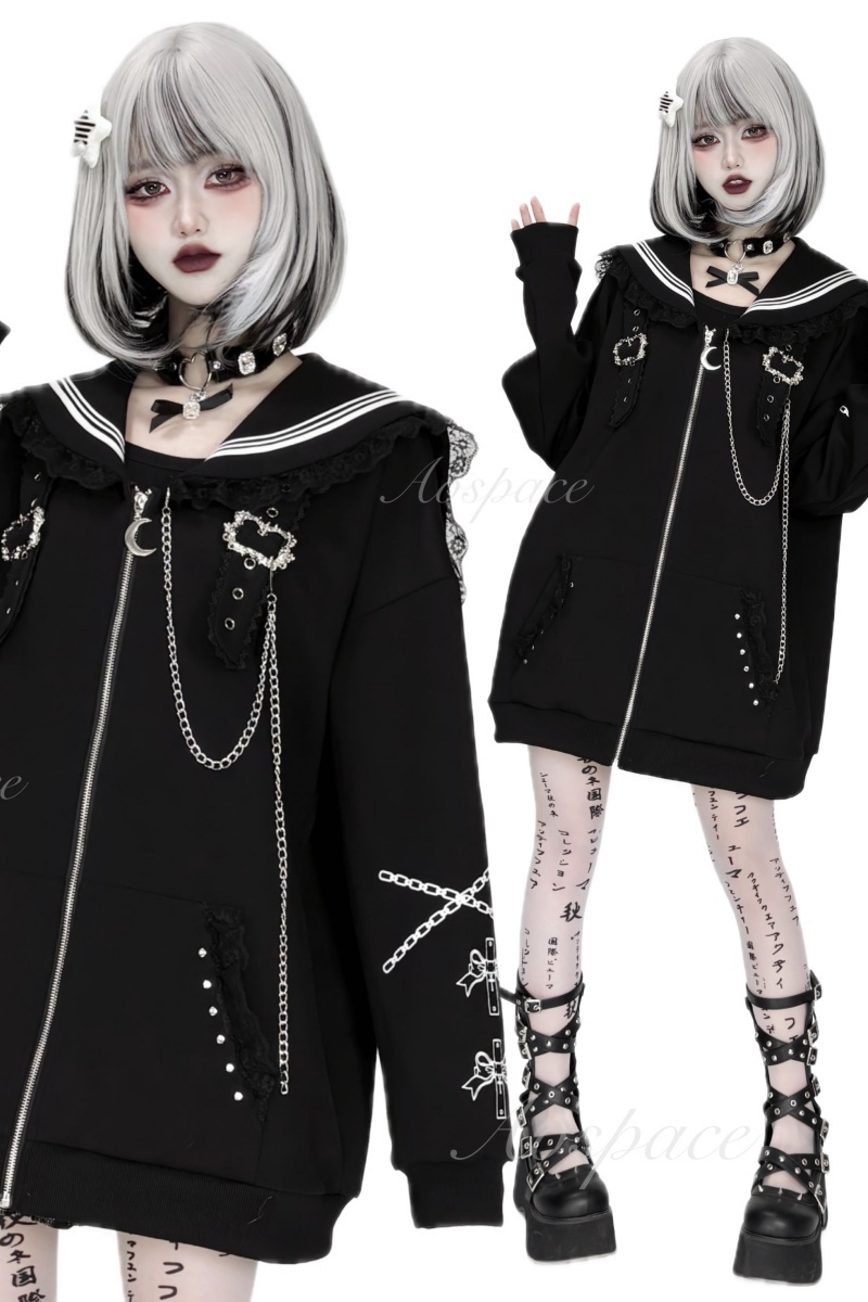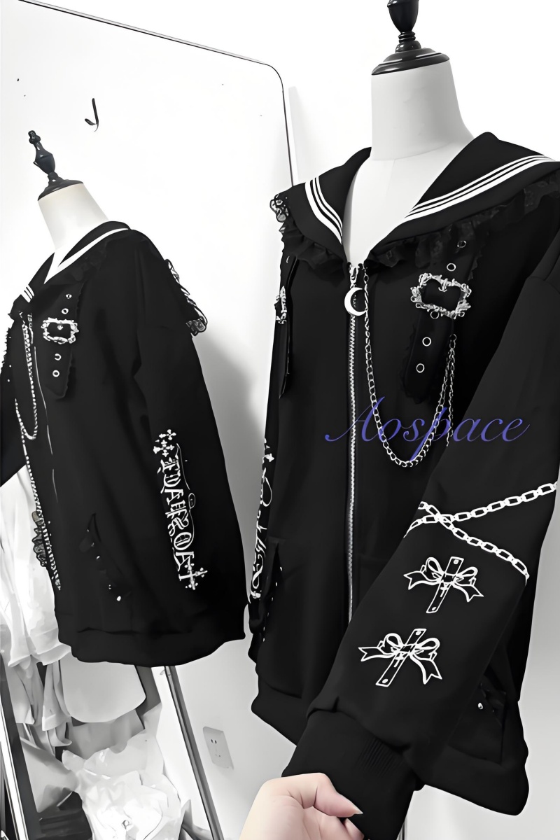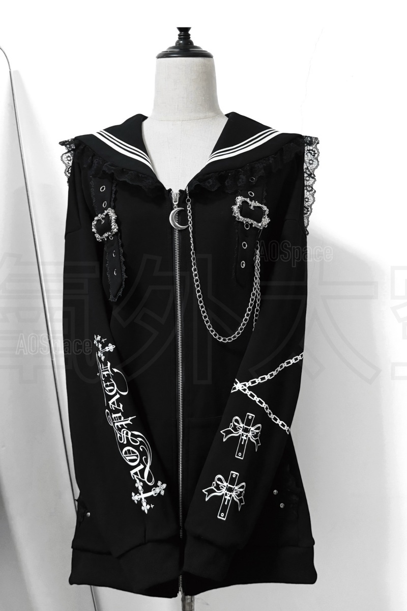 This overcoat is designed with cross prints, chain decoration, and sailor collar patchwork lace trims.