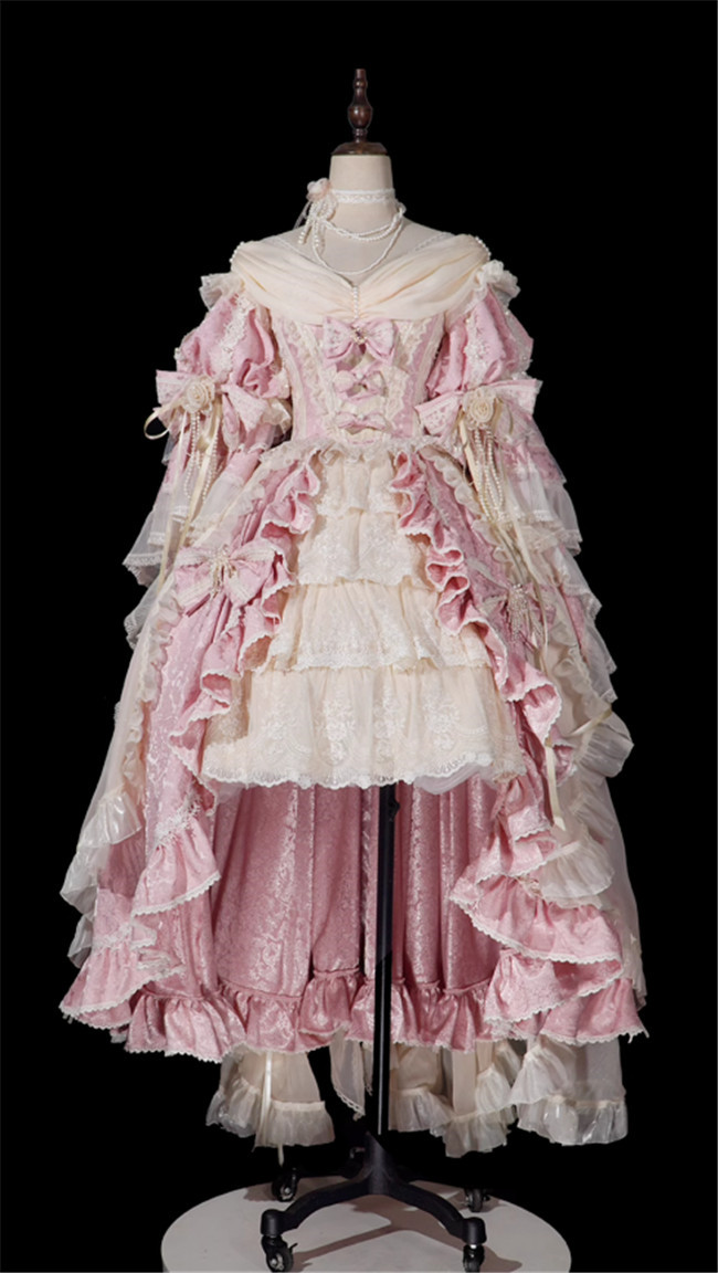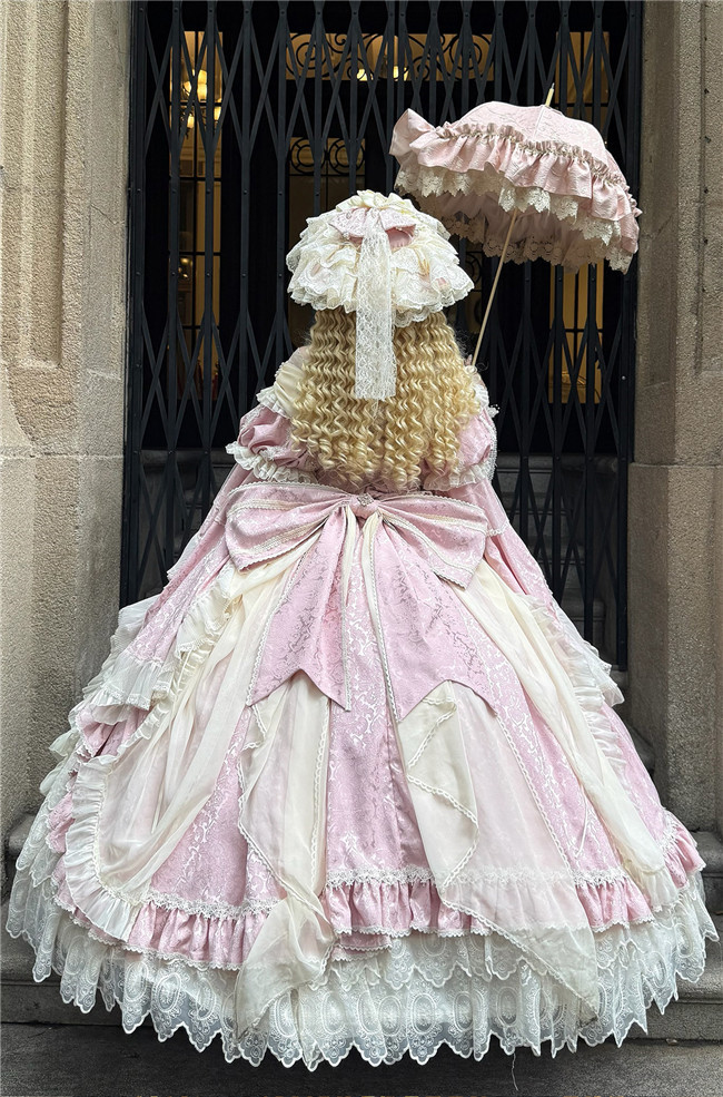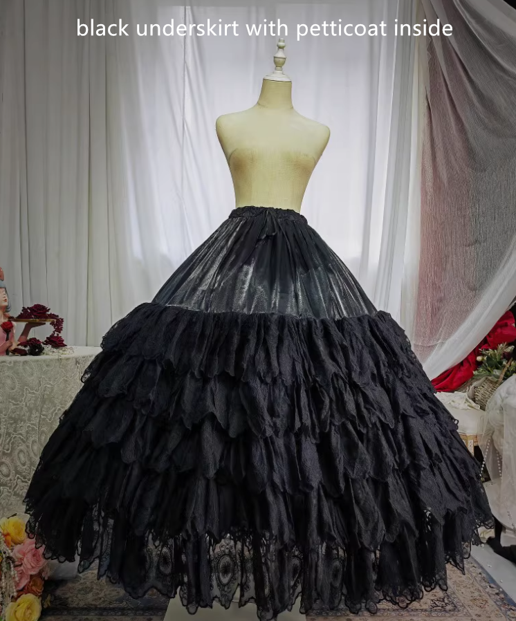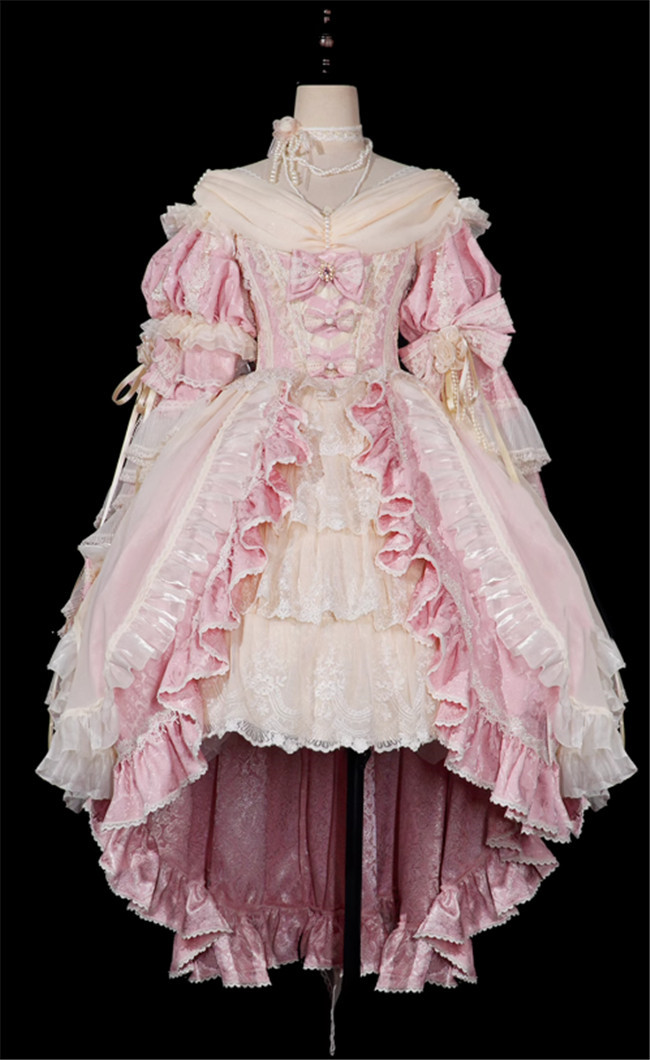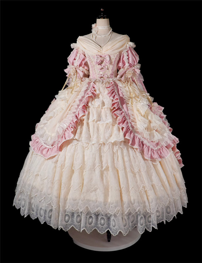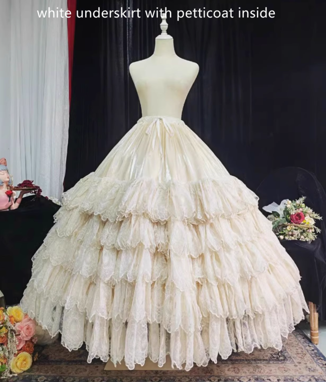 Full Set includes one piece dress, underskirt, petticoat, hat, bonnet, necklace and wrist corsage.