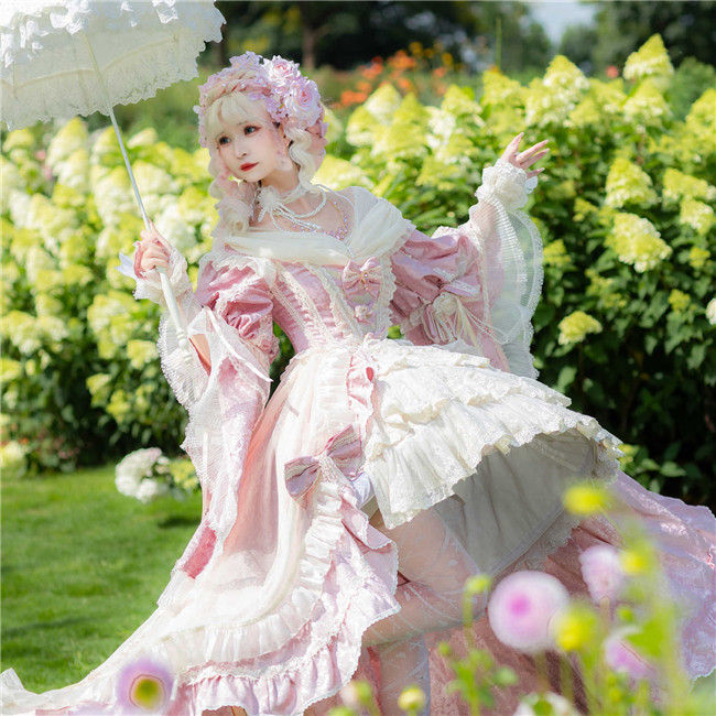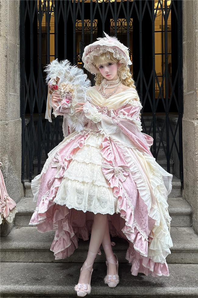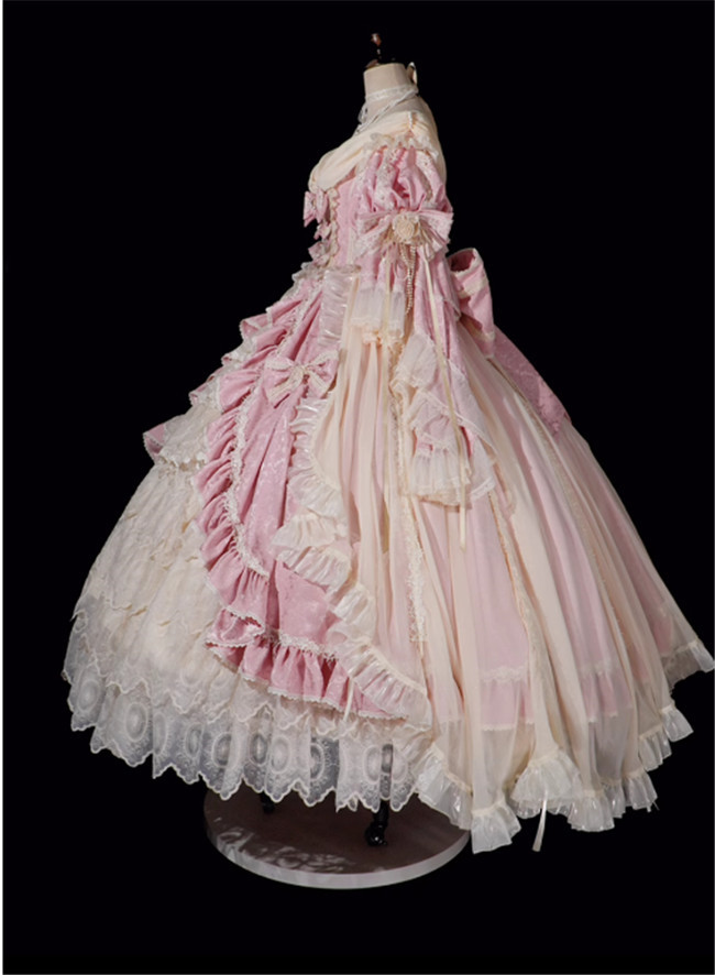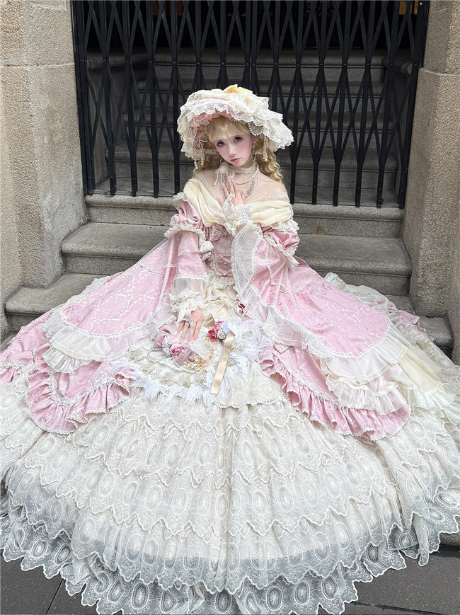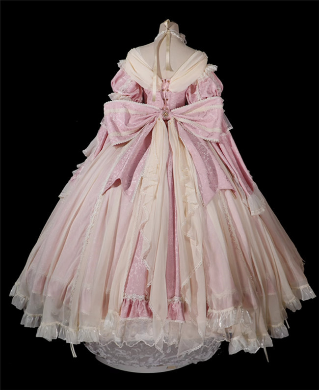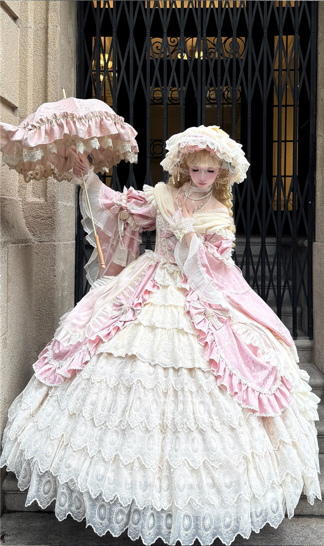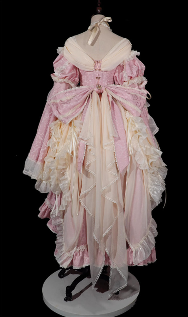 Full Set includes one piece dress, underskirt, petticoat, hat, bonnet, necklace and wrist corsage.