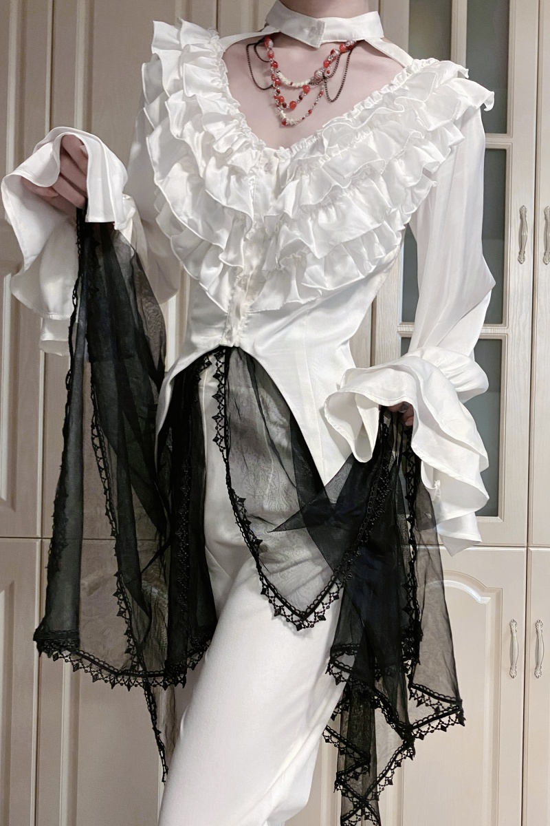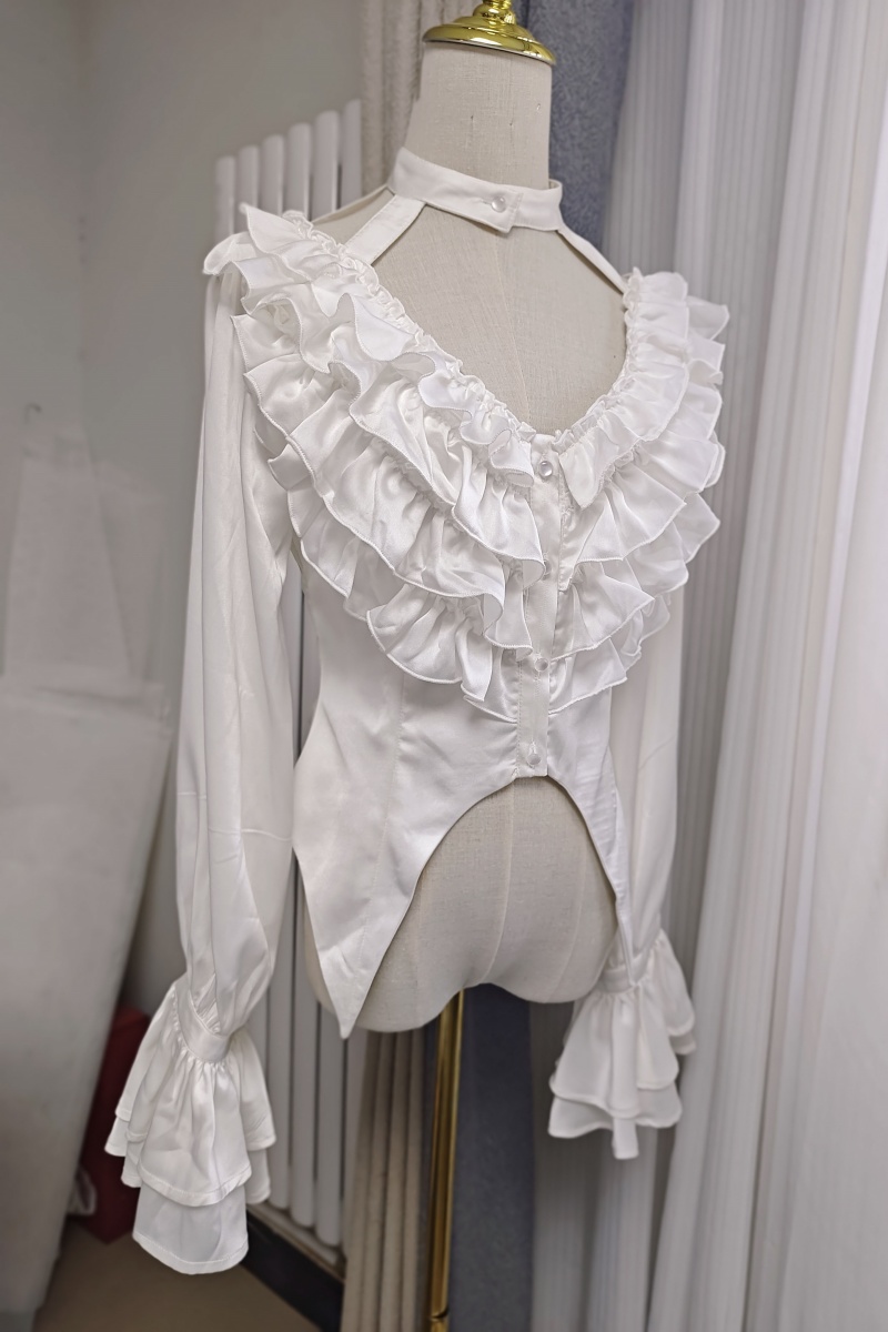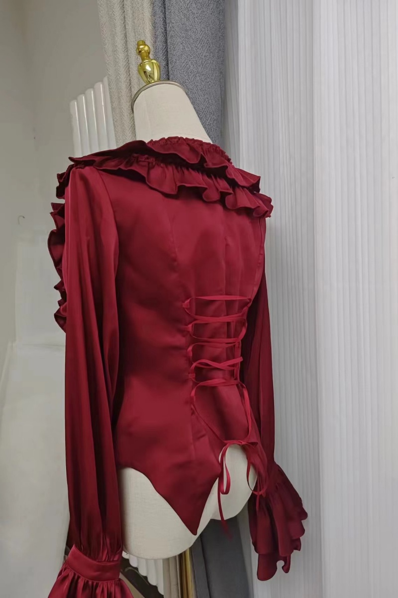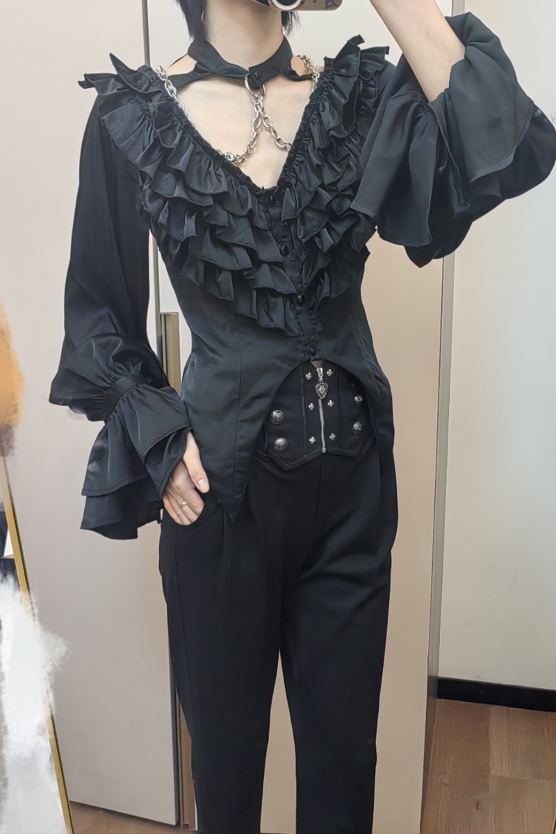 The chilling bone series is a gothic style blouse, including a simple style and a gorgeous style, and the features of the gorgeous style are a multiple-tiered neck and lace-up back, while the simple style features a hollowed out back. It is nice to wear or match with classic lolita dresses.