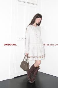 The round neck, embroidered patterns, and the upper and lower patchwork design create rich layers and a playful feel. Made of wrinkle-resistant and breathable gray and white fabric.