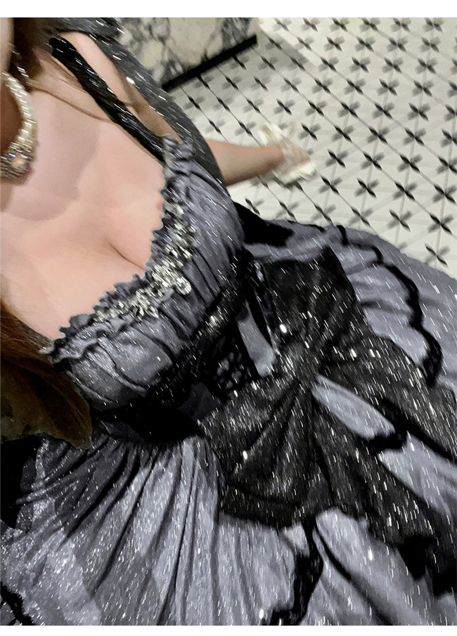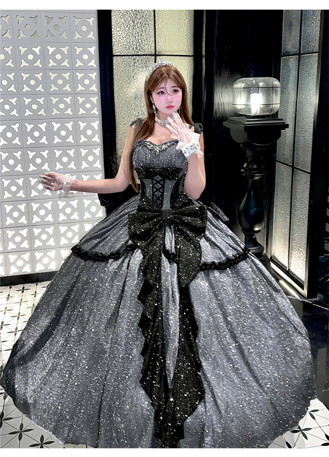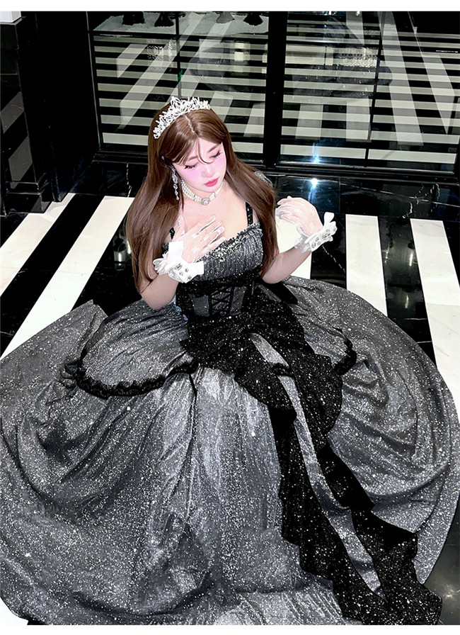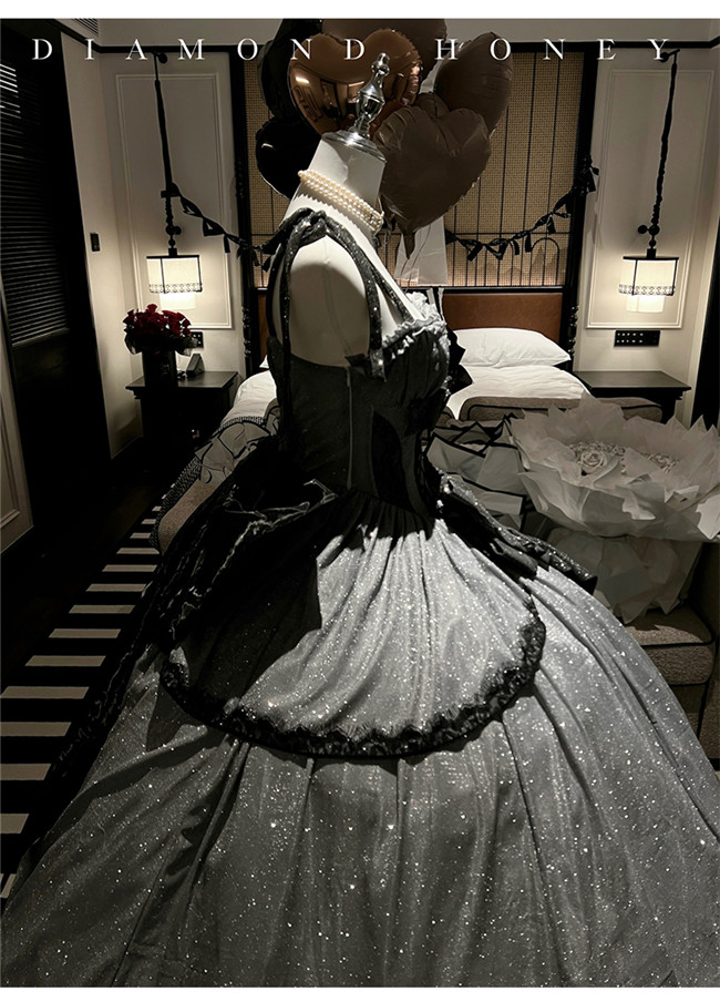 The fabric is very glittering and features built-in bra padding and fishbones, with adjustable shoulder straps and corset lacing, providing excellent body shaping.
