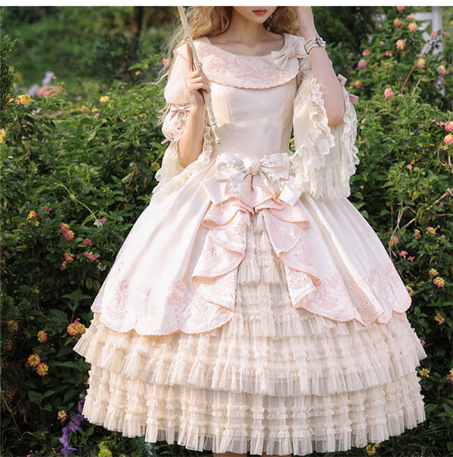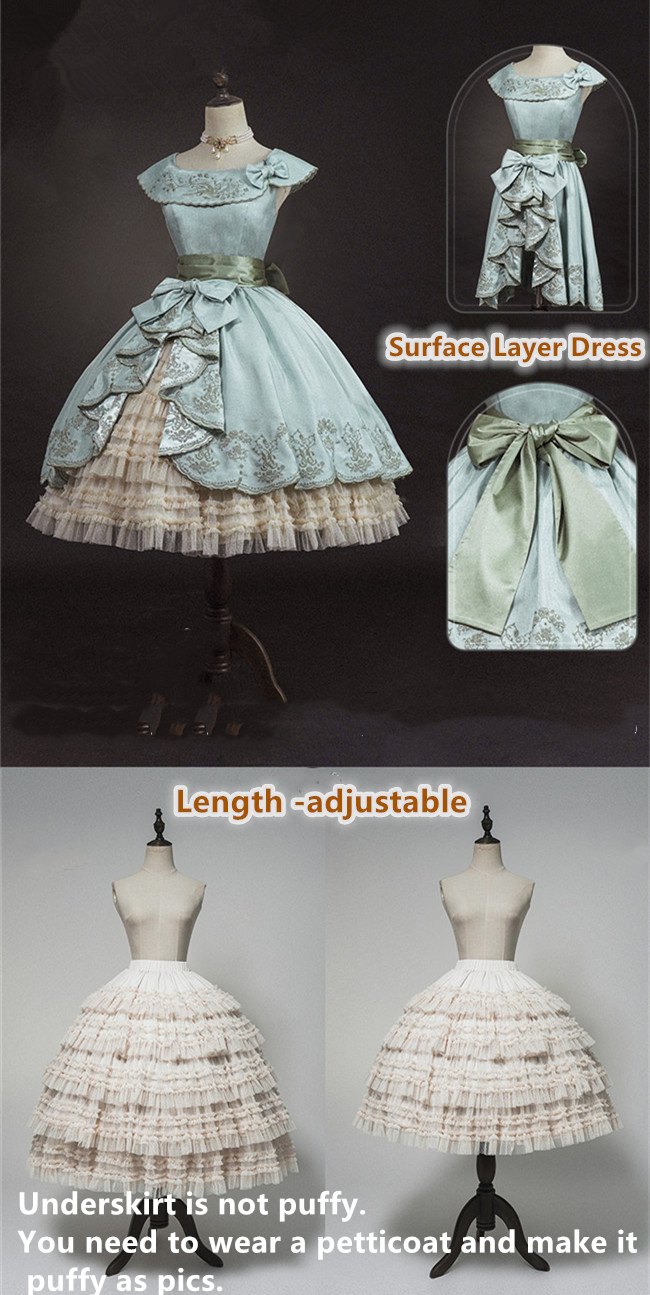 Elegant satin made classic lolita dress with delicate embroidery. The fullset includes the dress, heavy ruffles skirt, and blouse. It's good to order just certain pieces, or the fullset.