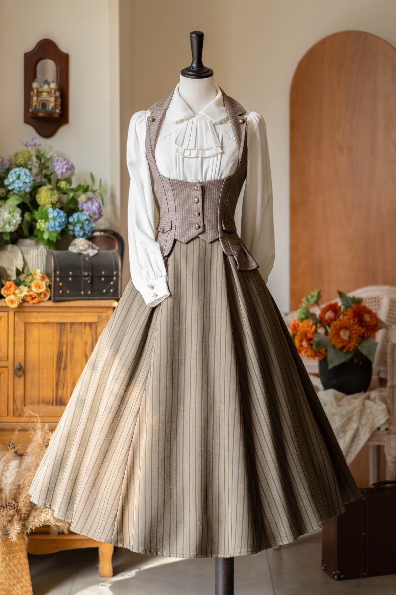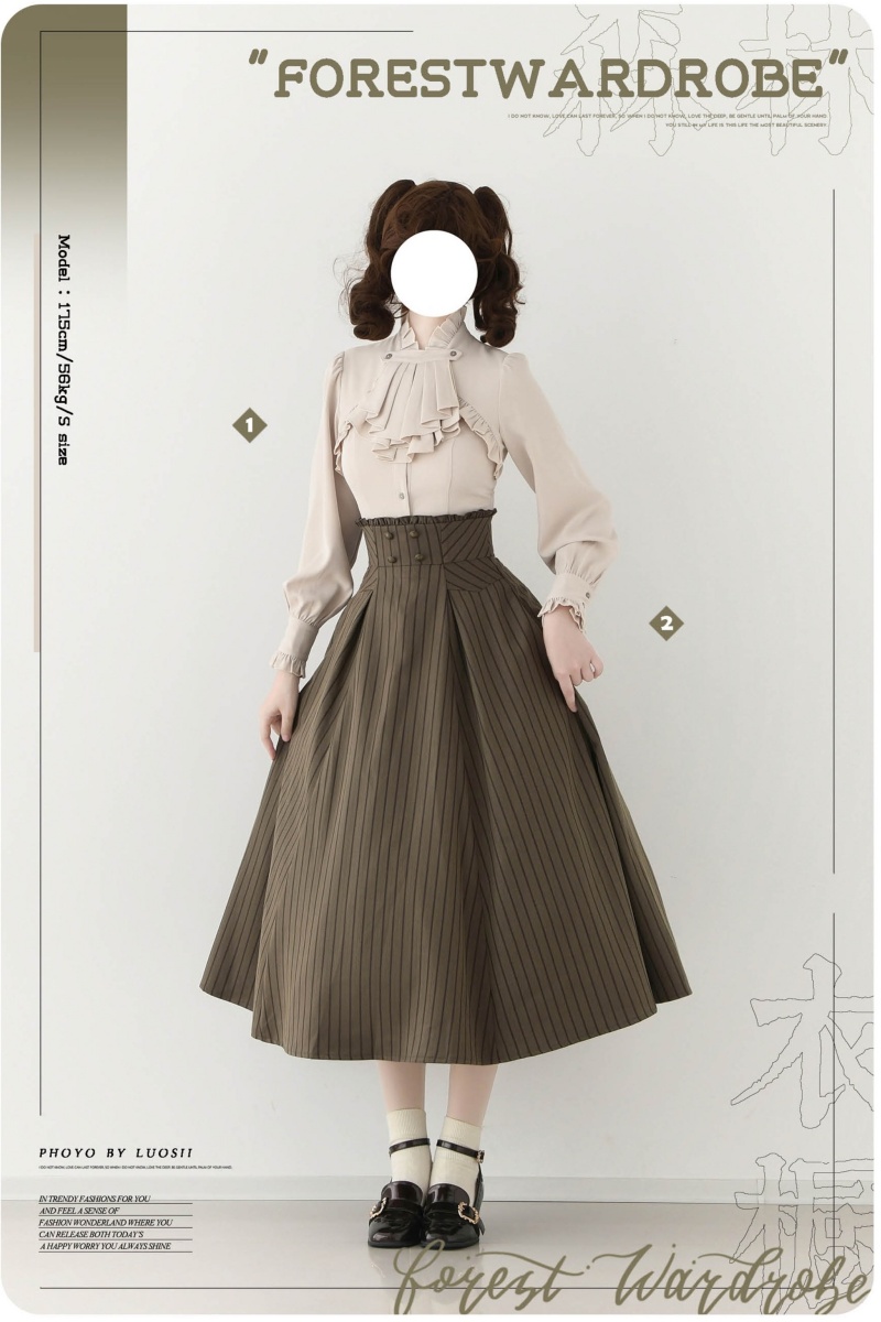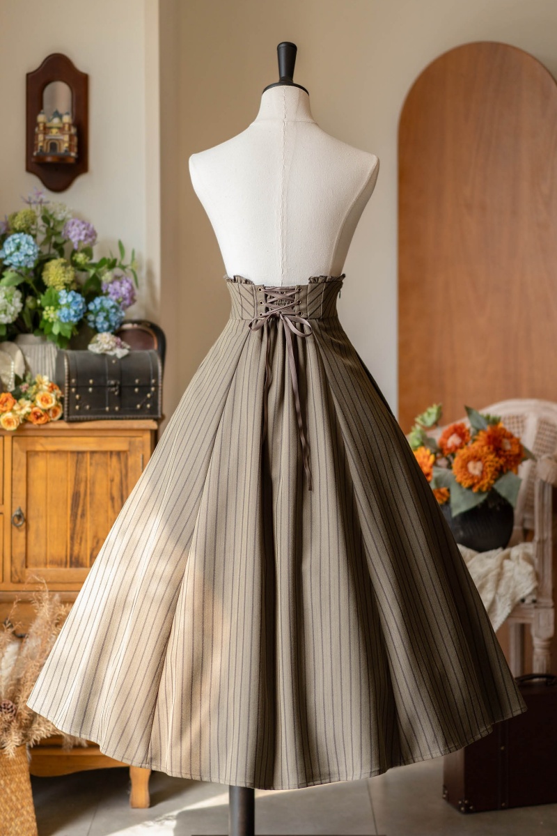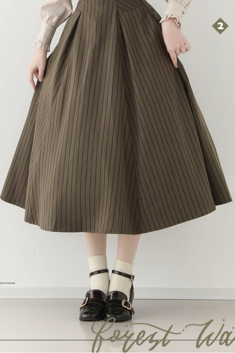 The classic striped skirt accentuates the waistline, featuring an oversized hem and elegant buttons. The side pockets are handy for daily outfits.