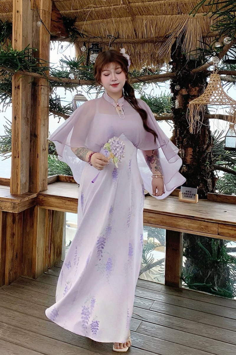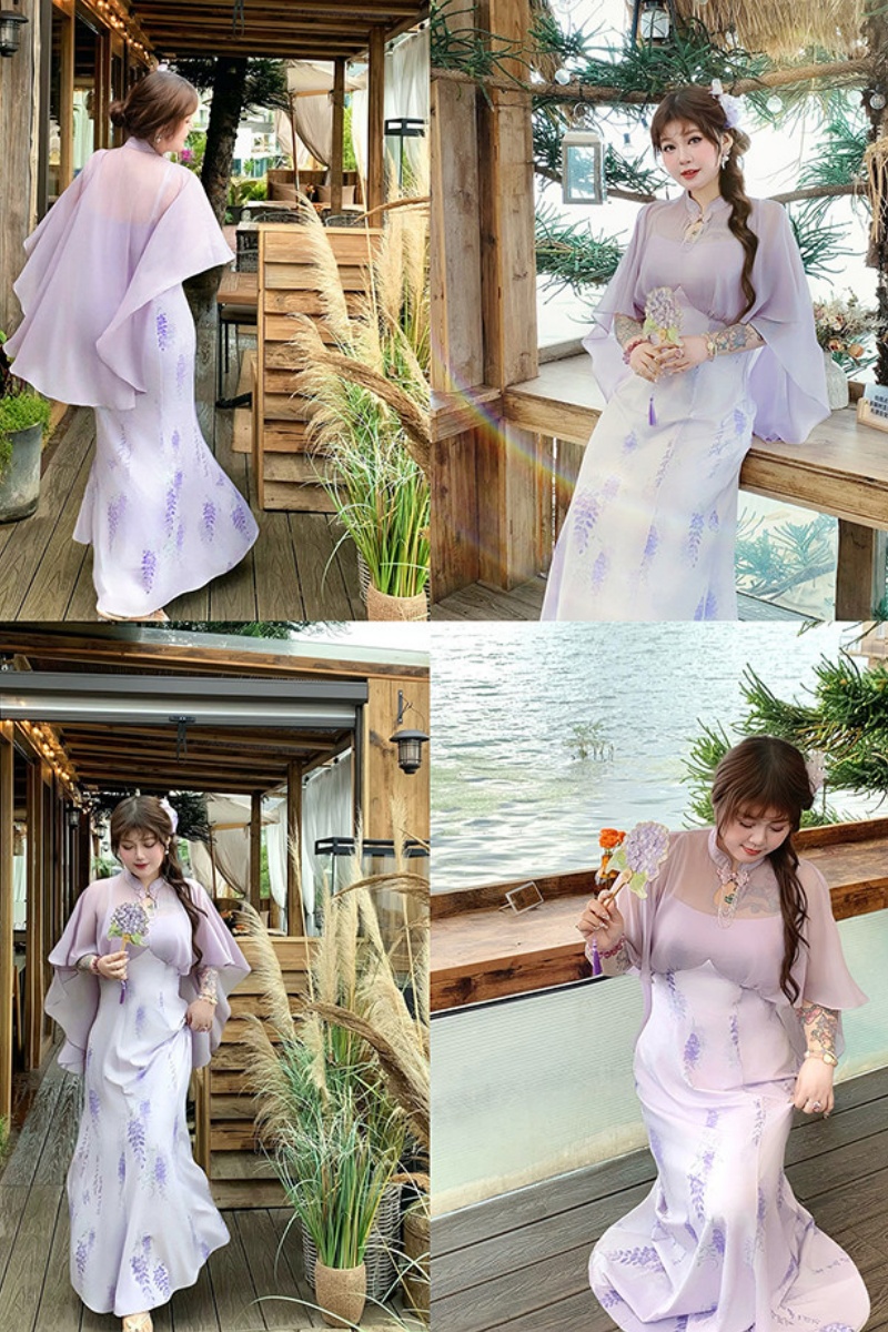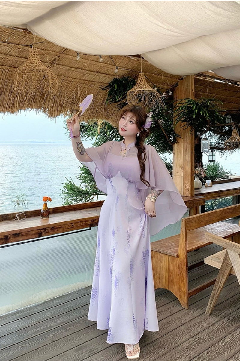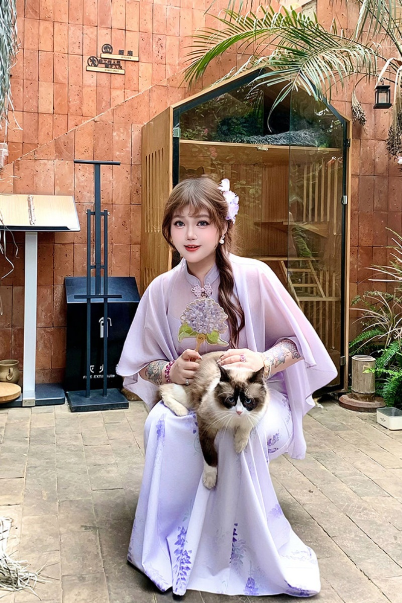 The wisteria dress has a unique design. It has ink-wash vines on a light purple fabric. The cape is made of flowing chiffon, which moves in the wind and looks amazing.