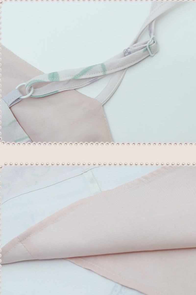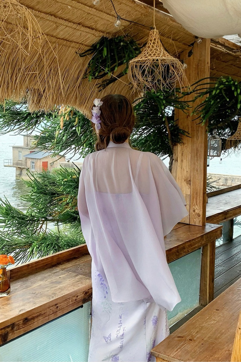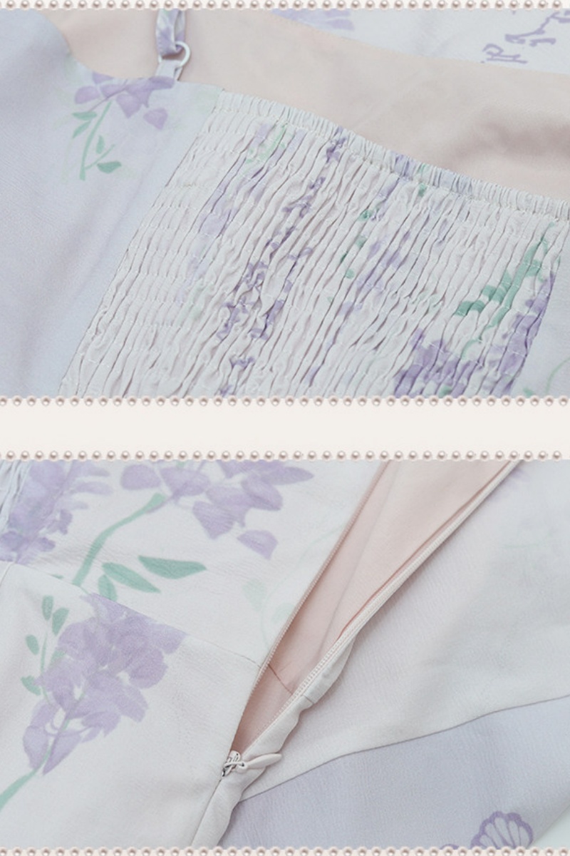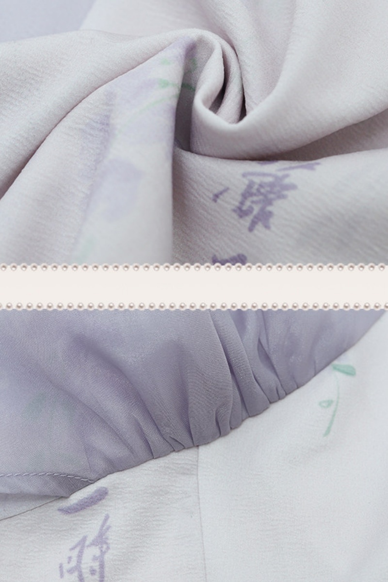 The wisteria dress has a unique design. It has ink-wash vines on a light purple fabric. The cape is made of flowing chiffon, which moves in the wind and looks amazing.