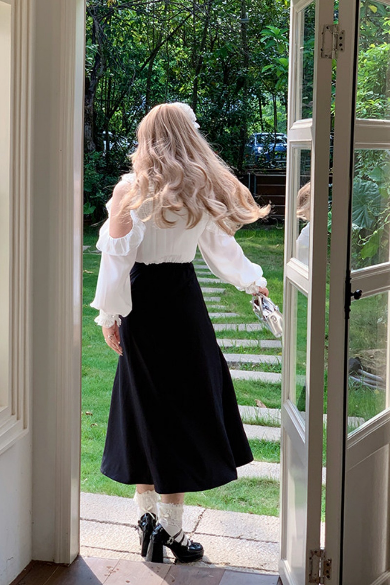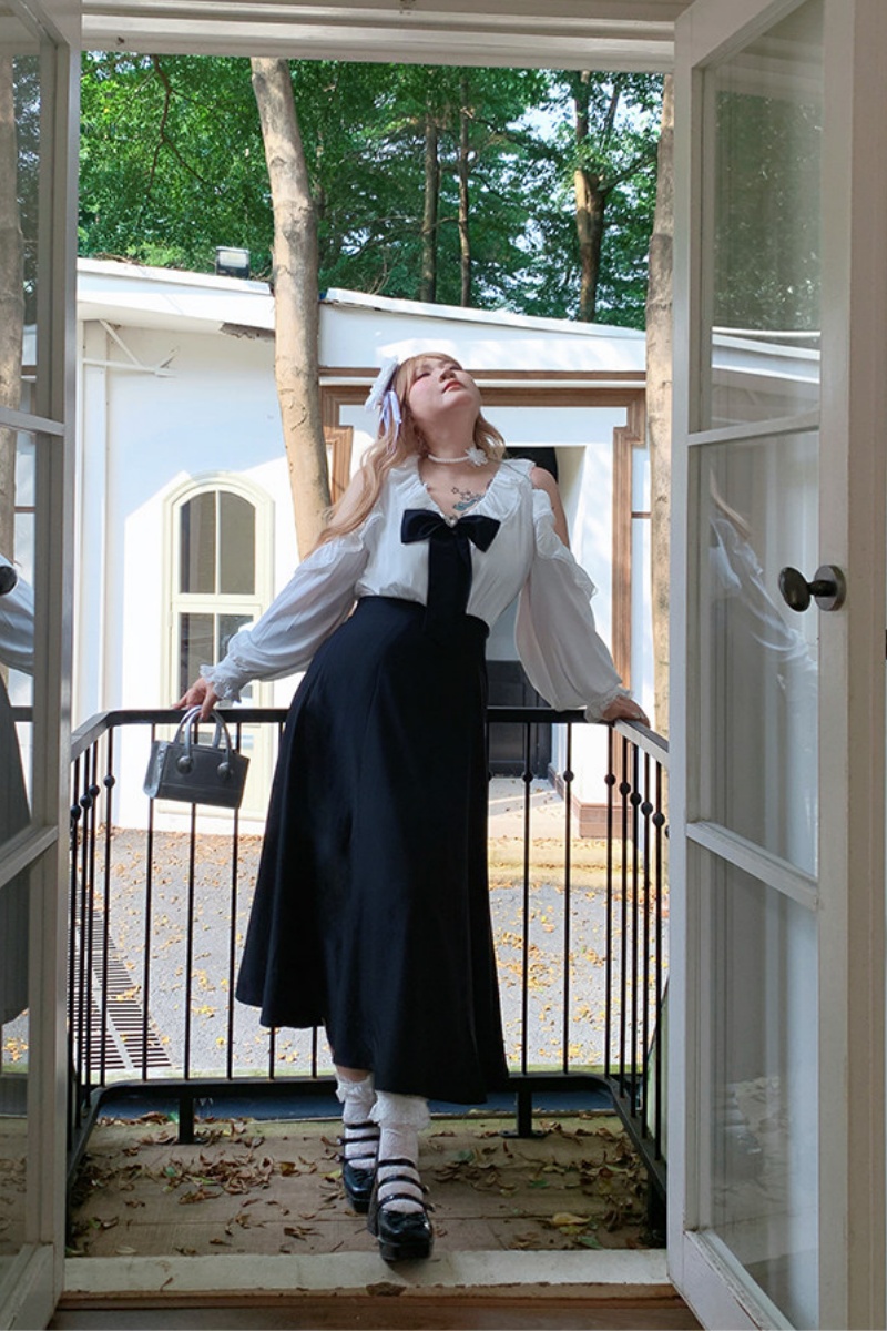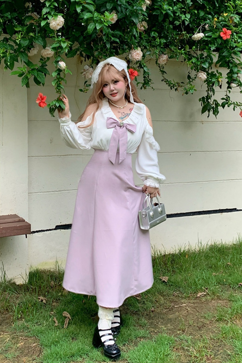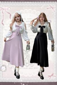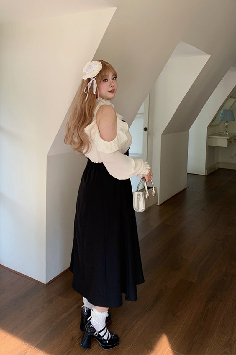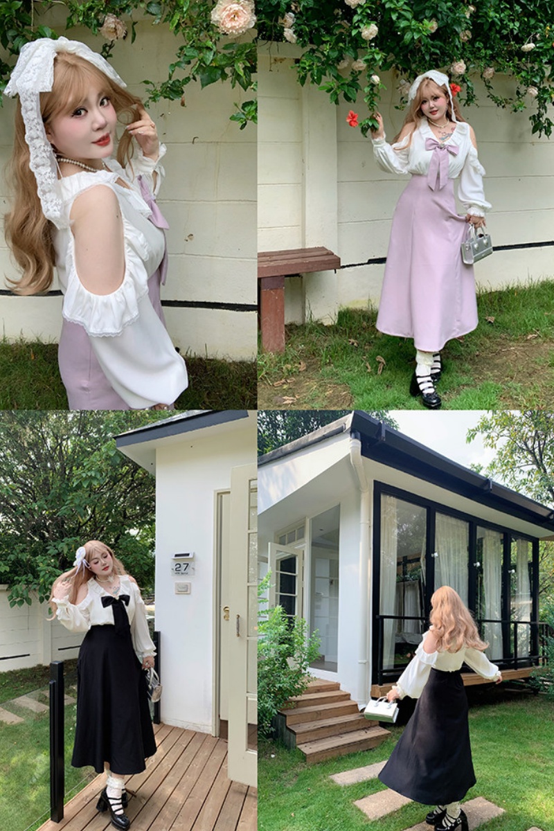 The A-line shape and high waist make you look slimmer and taller. The design has a bow and off-the-shoulder puffy sleeves, creating a stylish look. The pink and black colors, which represent smartness and sweetness, work well together.