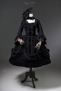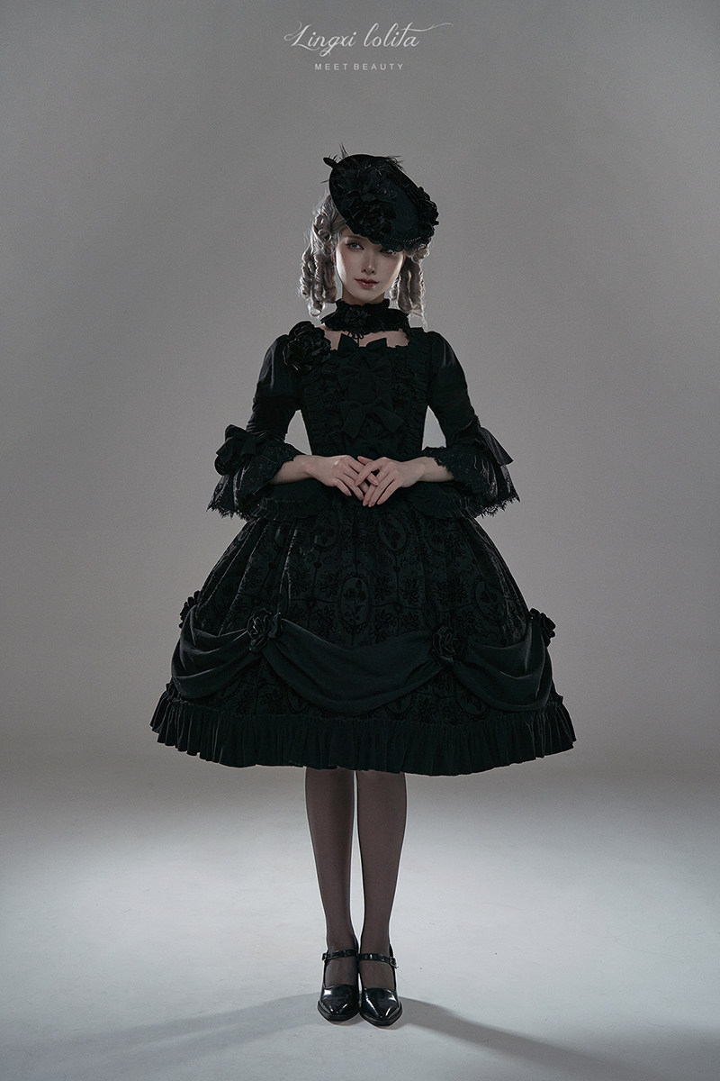 The newly released 'Night Falls on Versailles' set by Lingxi Lolita features a stunning Gothic aesthetic. While this is a coordinated top and skirt set, its seamless silhouette looks just like a one-piece dress, so we have included it in the OP category. Please note that the handmade embroidered choker and matching flower set are exclusive to the full set and are not sold separately.