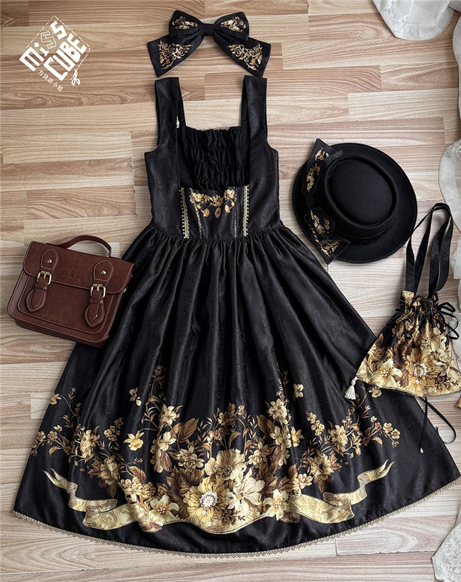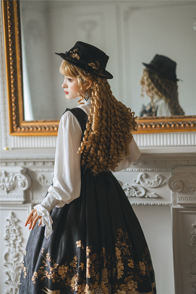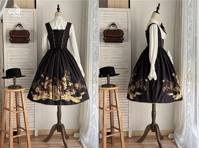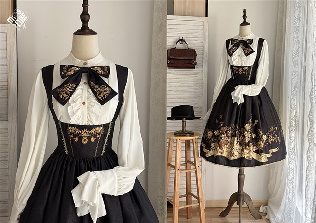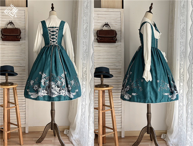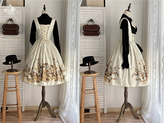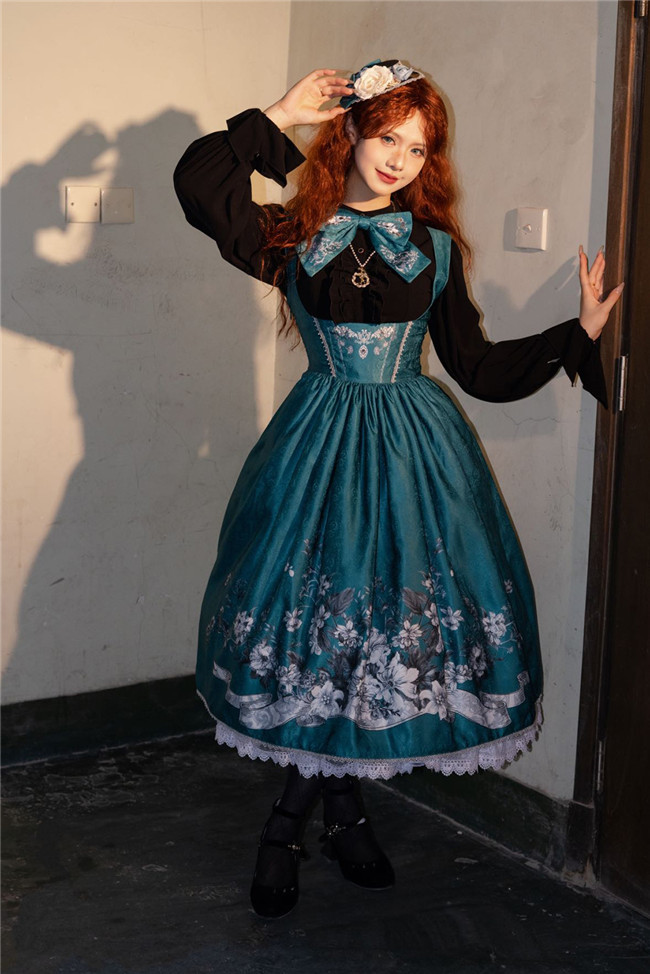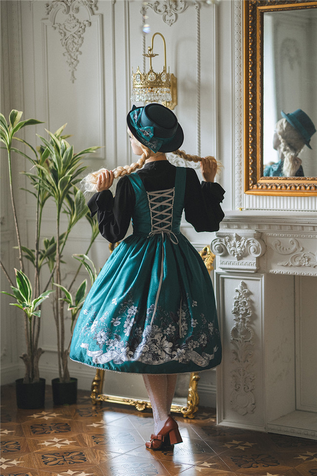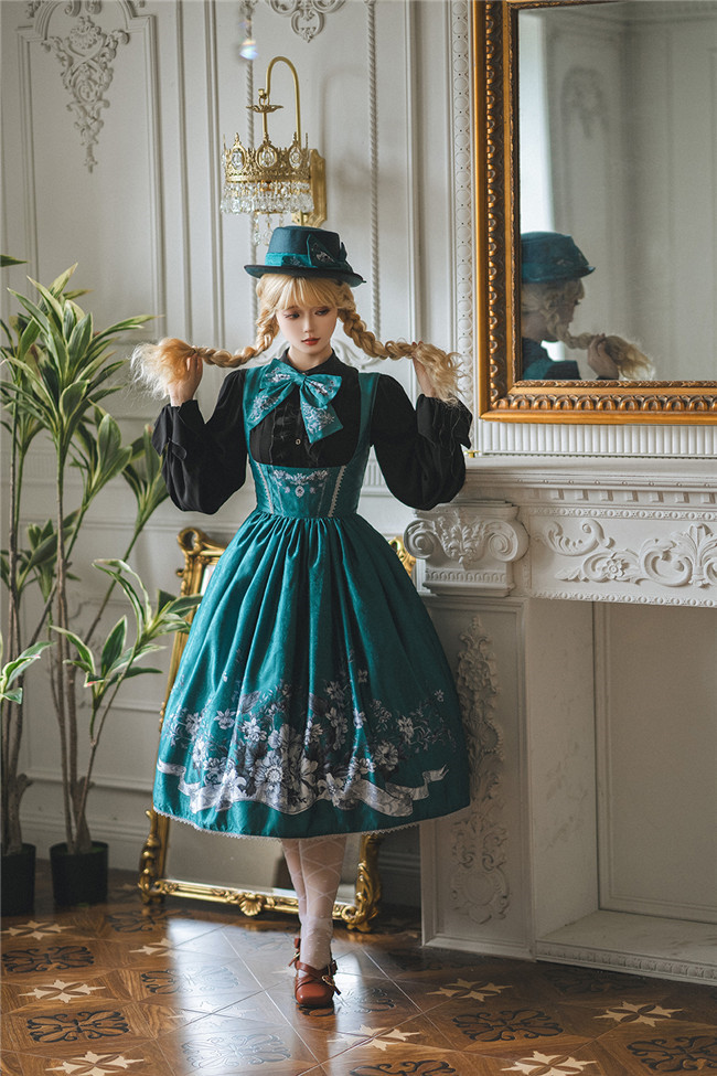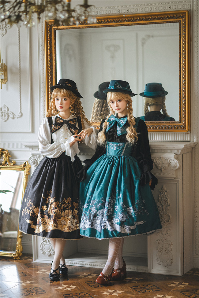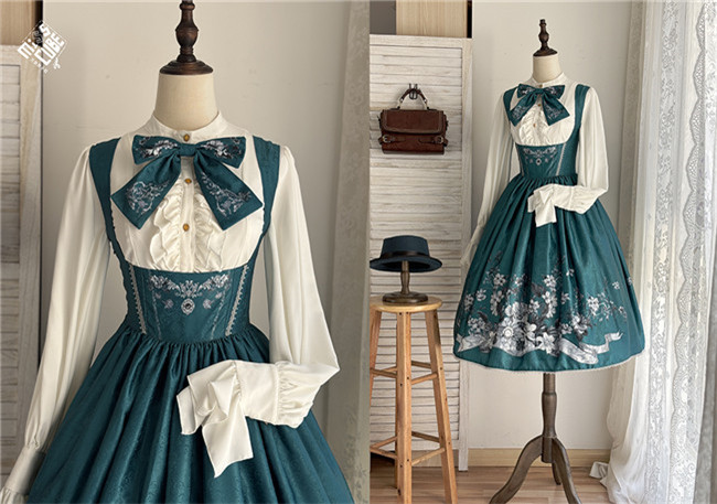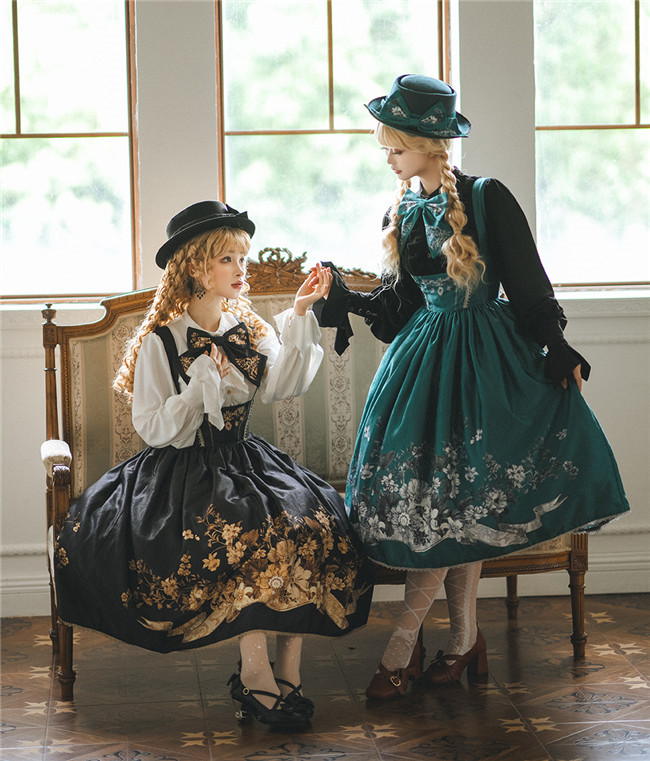 Miss Point Sunset Retro Style Corset Lolita Dress and Blouse, for your retro and elegant look. This dress is made by dark jacquard print fabric, blended lining, gold mesh, silver chiffon, etc. Available in black, beige and blue green, with side 2 pockets