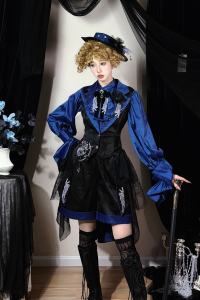 This Gothic Lolita style vest, shorts and pants from the Miss Point series, Vest with rose embroidery on the collar, ornate metal buttons, and a structured silhouette, embodying dark and elegant charm. The shorts and pants designed with a loose silhouette and waist ribbon and delicate buttons, enhancing the vintage, atmospheric charm of Gothic Lolita and Ouji style ensembles.