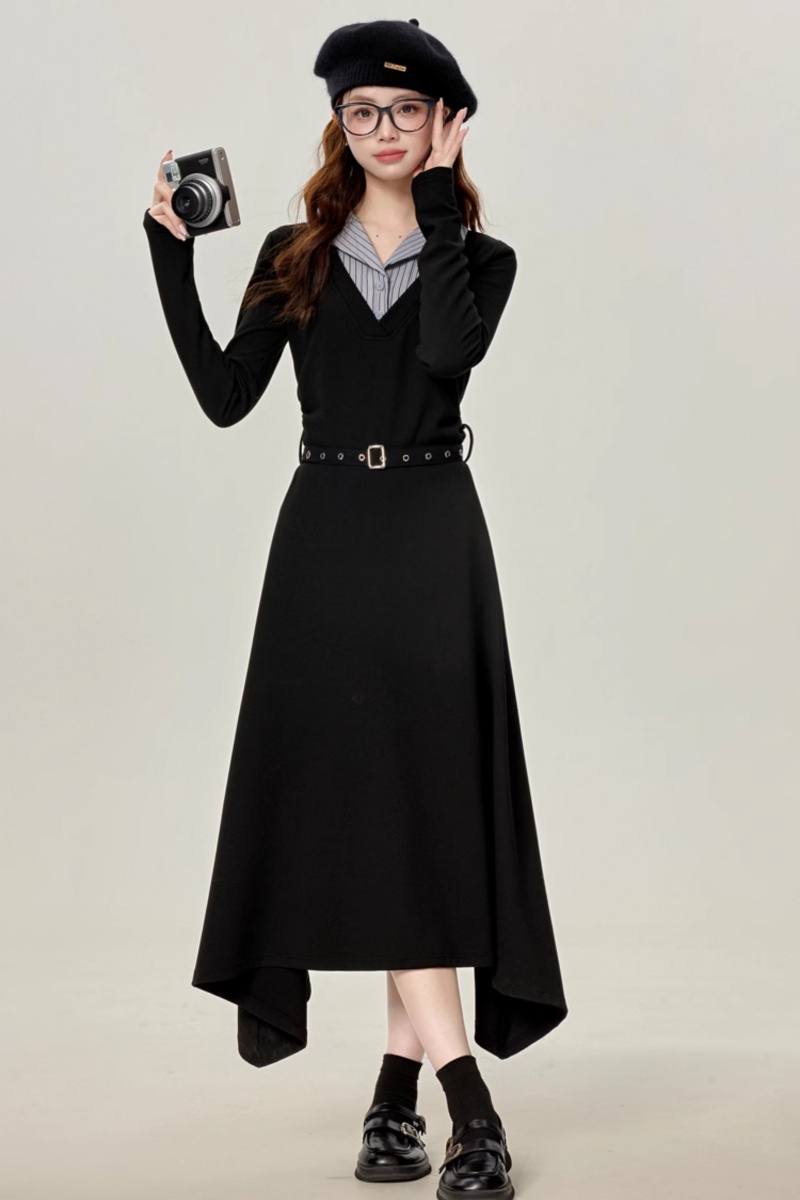 Polyester and cotton fibers are soft and cozy. This dress showcases a patchwork design, a shirting-collar overlay at the V-neckline and is paired with a belt, while the asymmetric hemline infuses elegance.