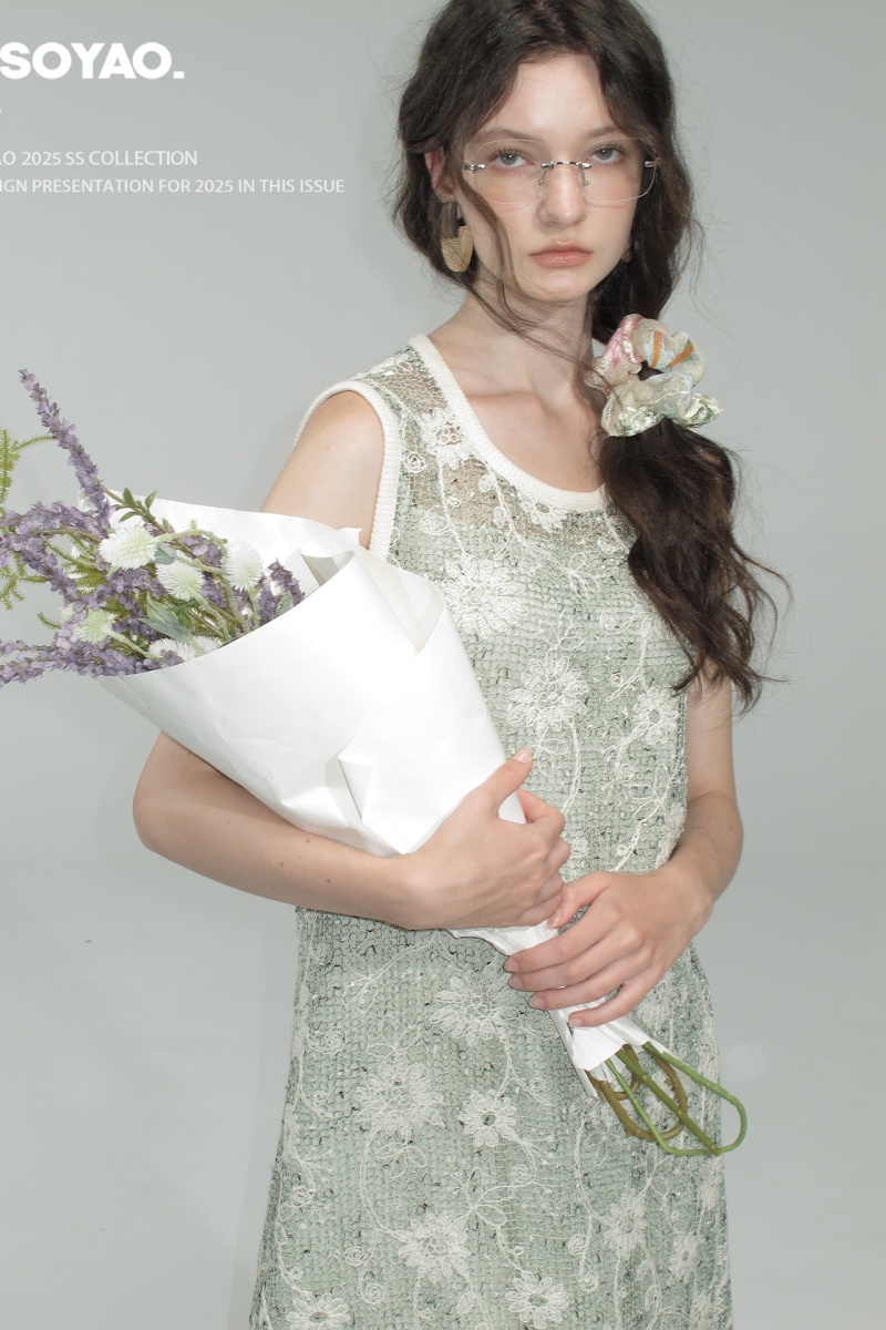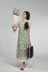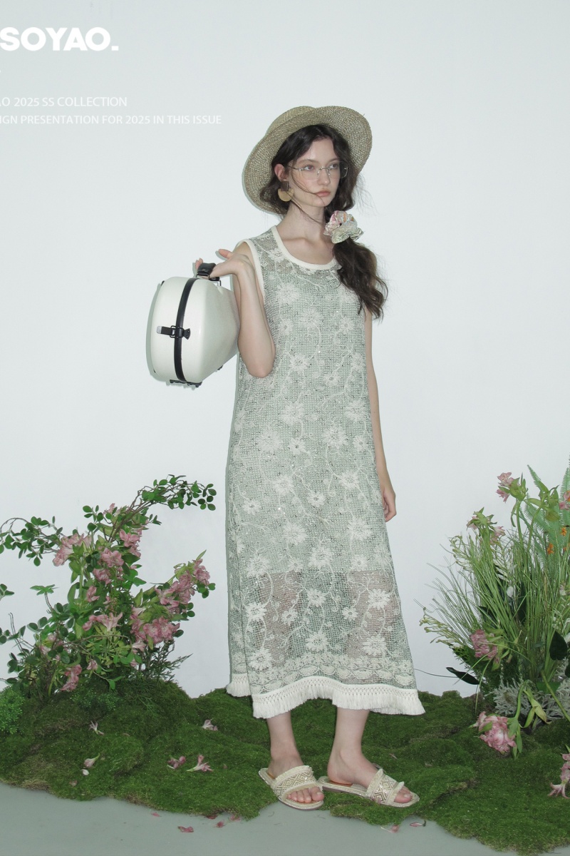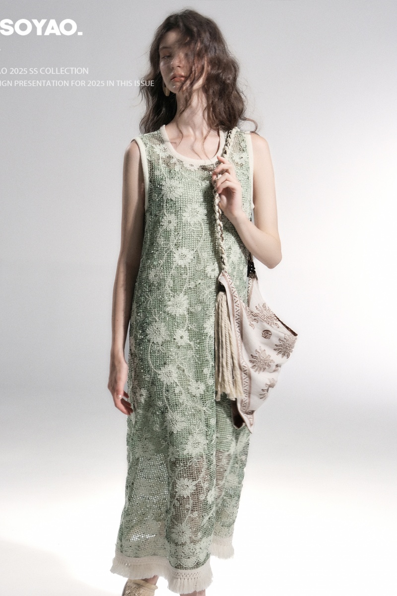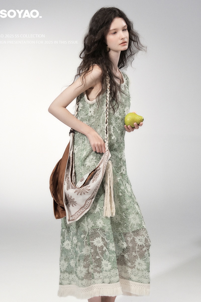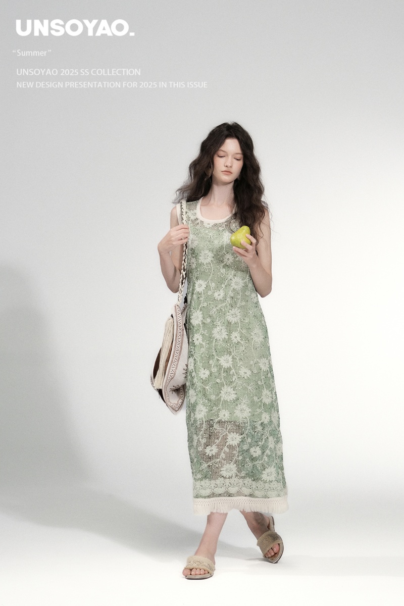 Light green hollowed grid polyester fabric. The ingenious design of the two-piece creates an overlapping effect between the inner and the outer. The tassels at the hem sway gracefully with each step.