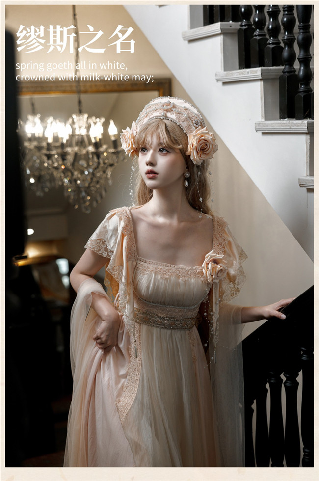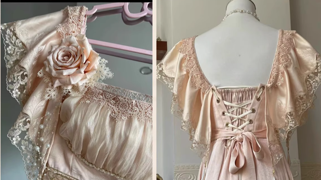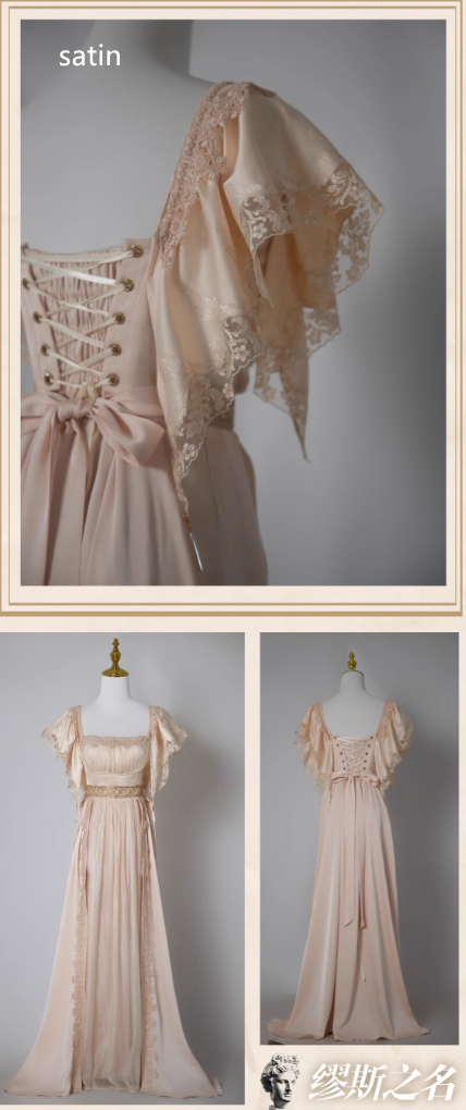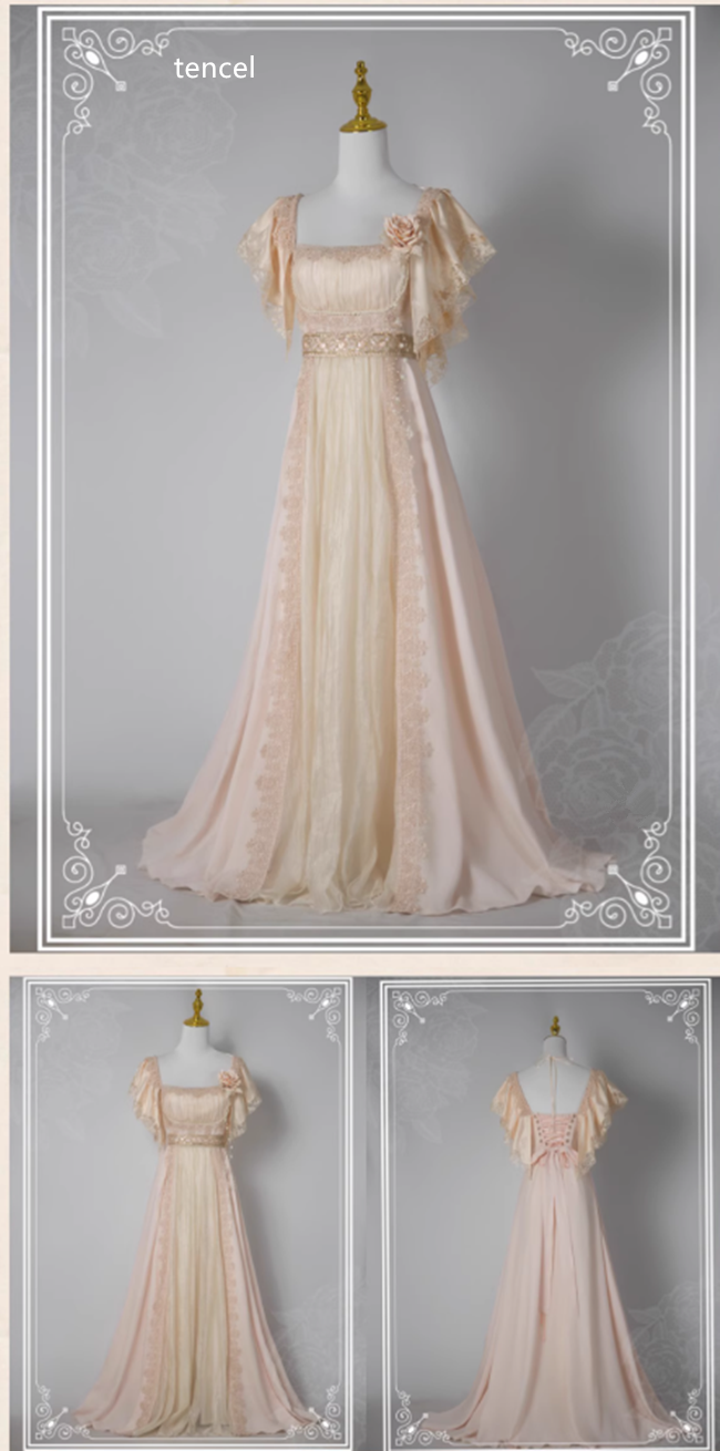 This regency era dress is available in two fabrics: satin and tencel. It features delicate lace, a side zipper, built-in bra pads, and a removable waist belt.