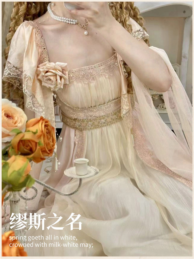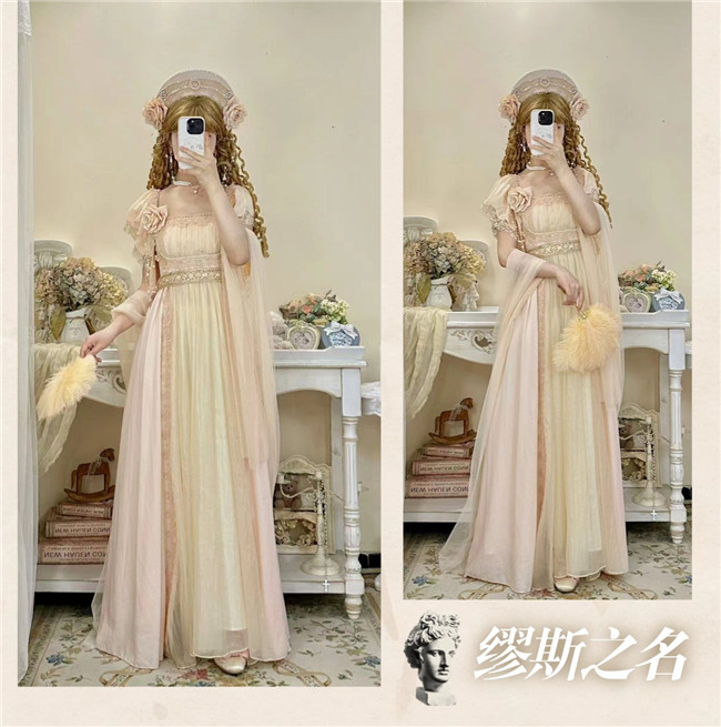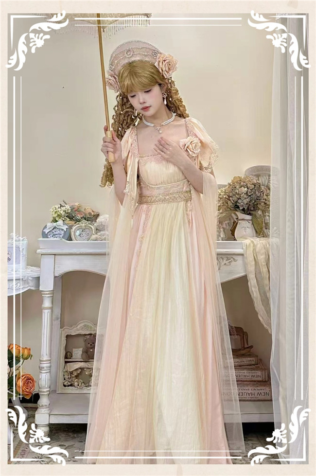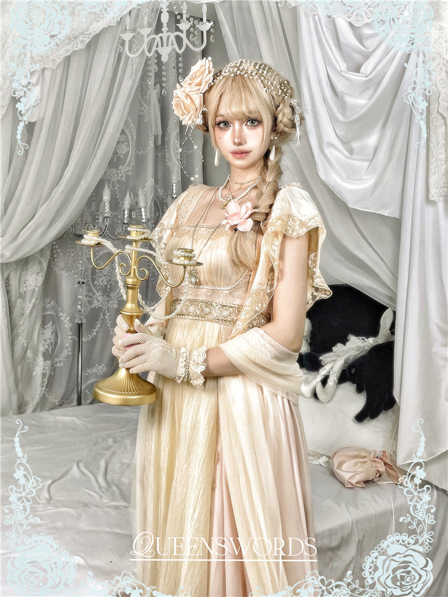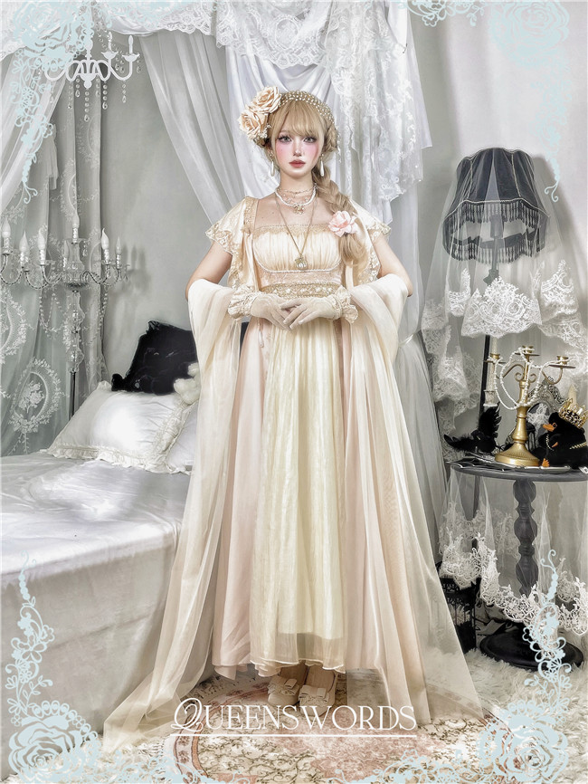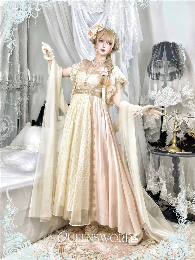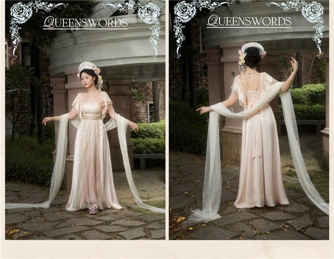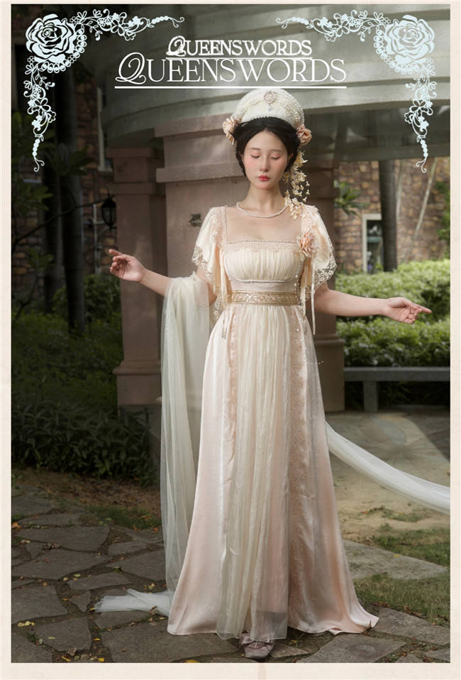 Full Set includes an one piece dress, detachable waist belt, flower brooch, pearl pendant, crown, shawl and purse.