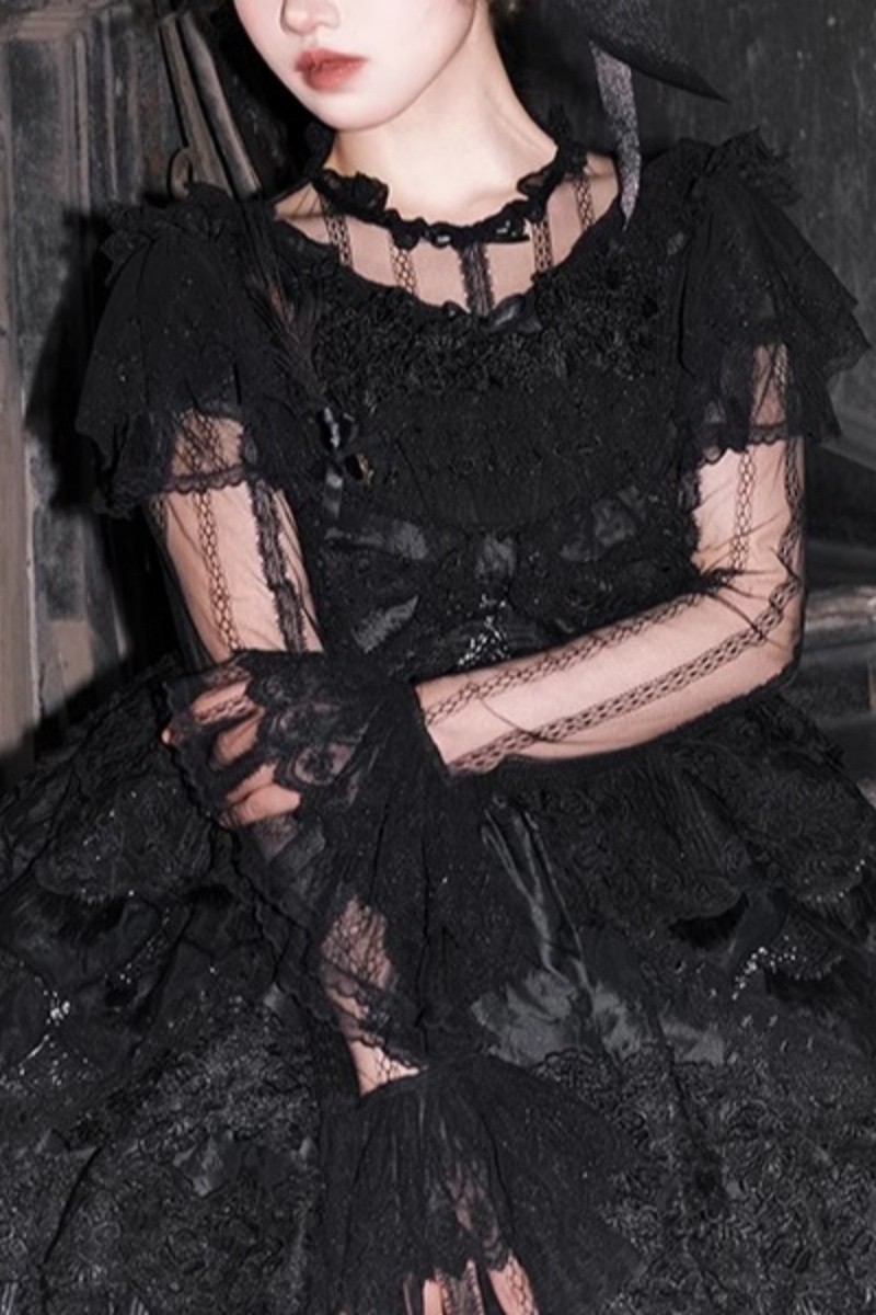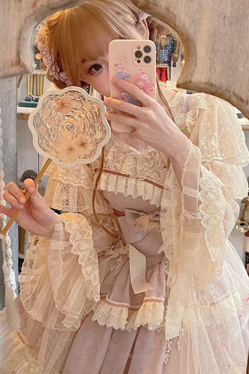 This blouse, with super fluffy sleeves, lace, petal layers, and floral throughout, is available in three colors to complement different Lolita outfits.