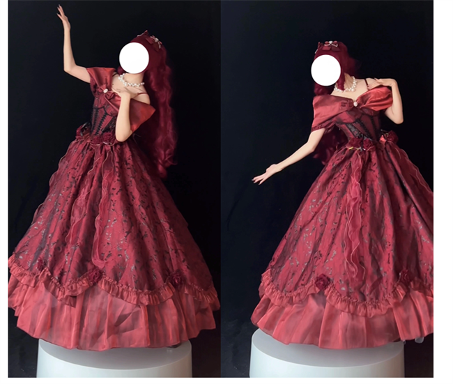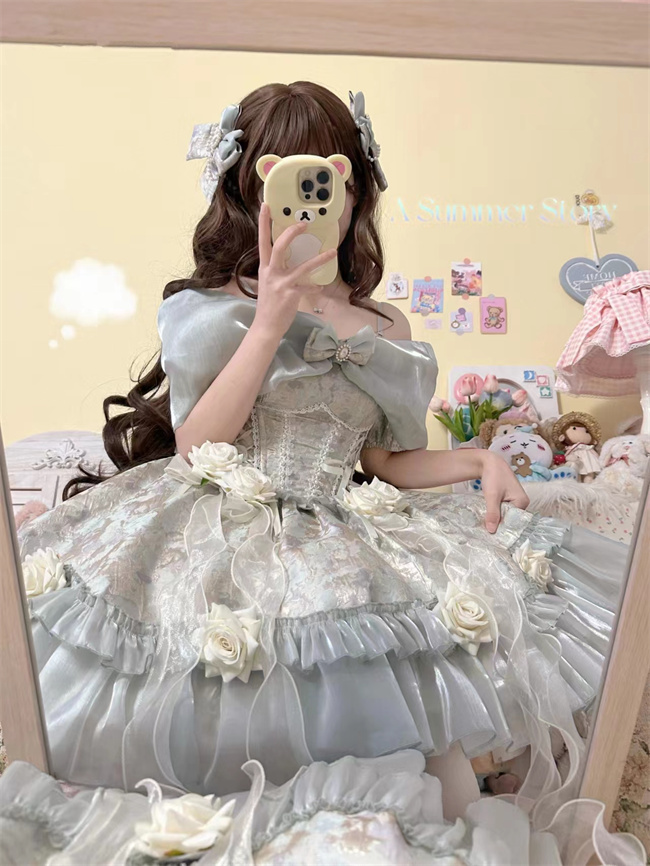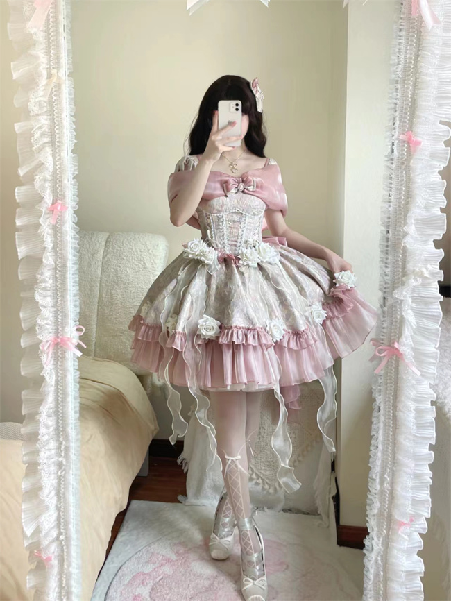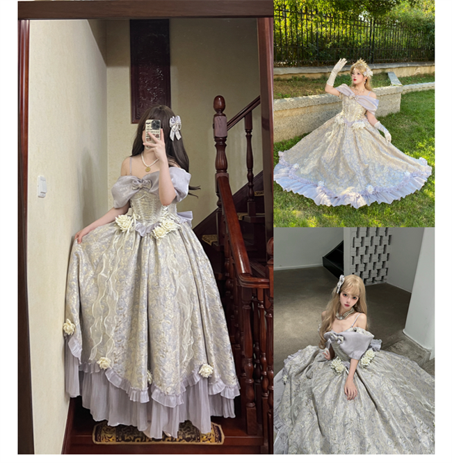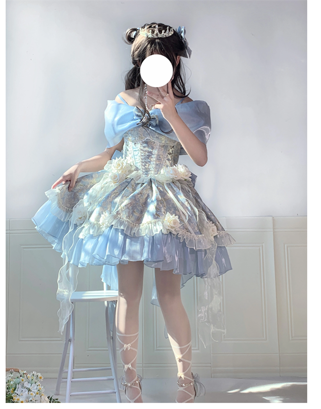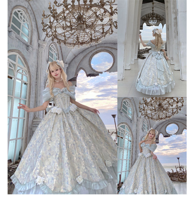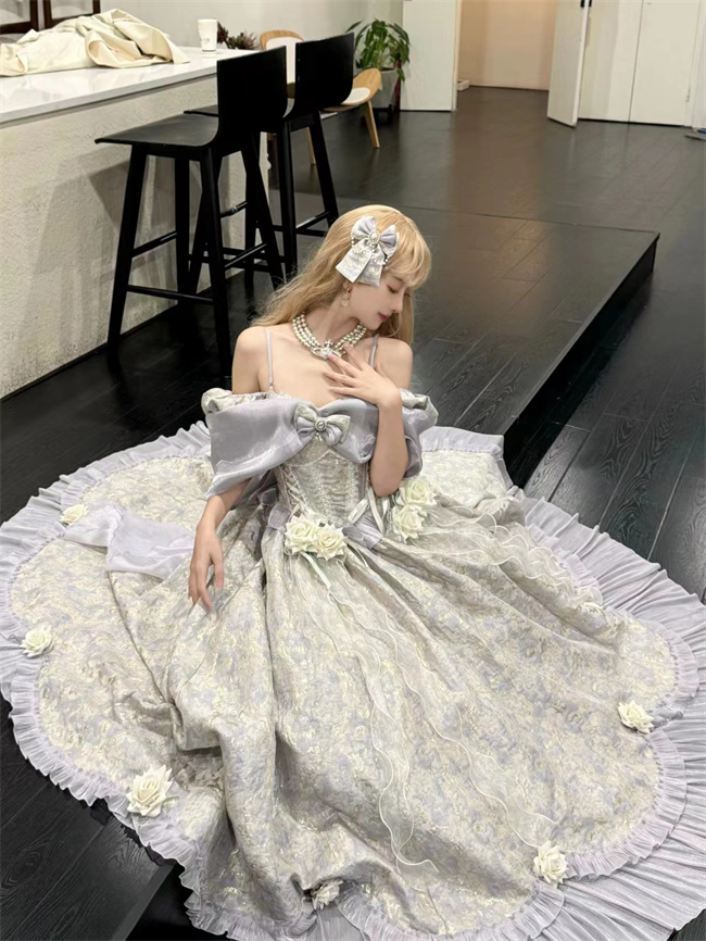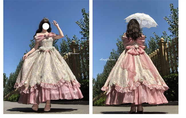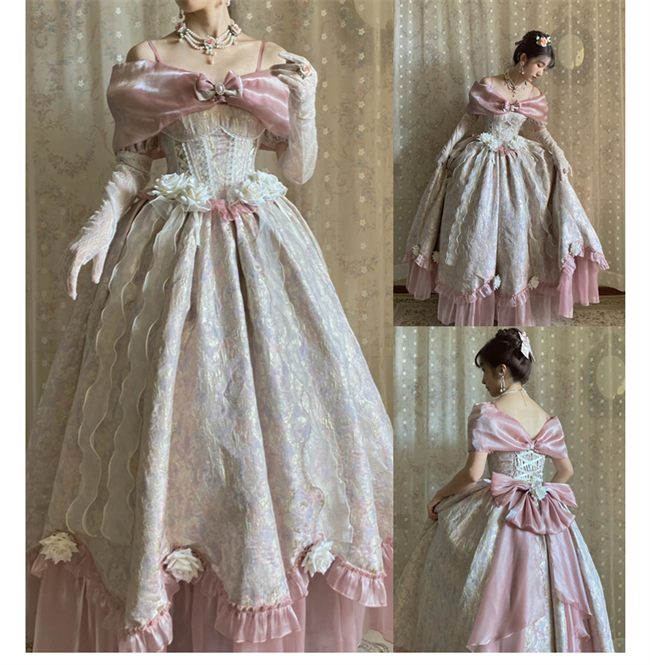 ***Composed of: A jumper dress, bowknot shawl and flowers on the dress, the tailing, side clips and other accessories shown in the pics are not included.