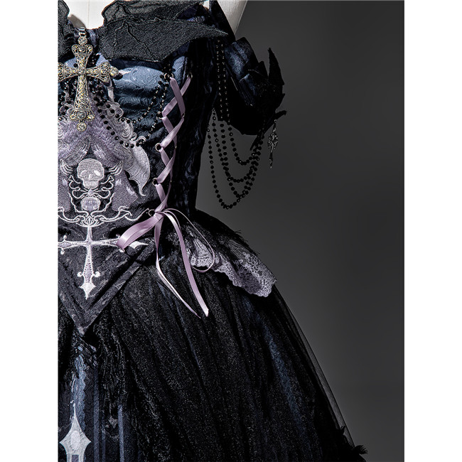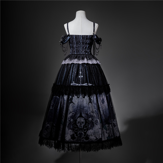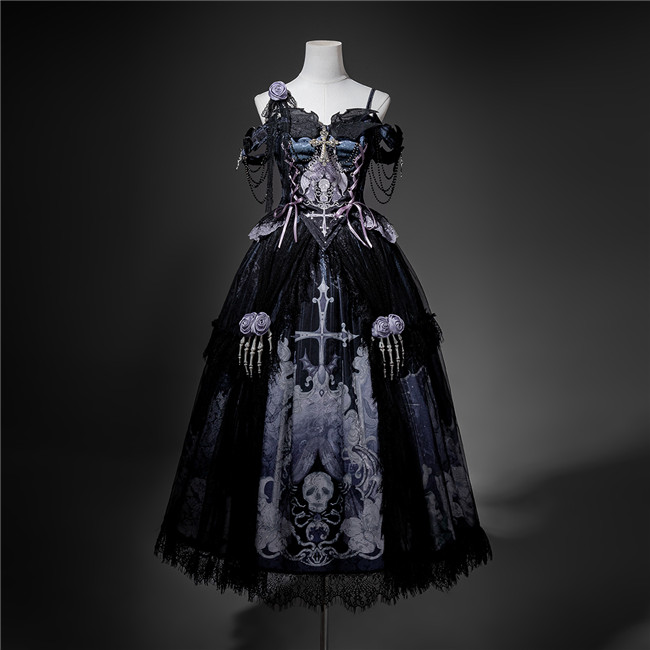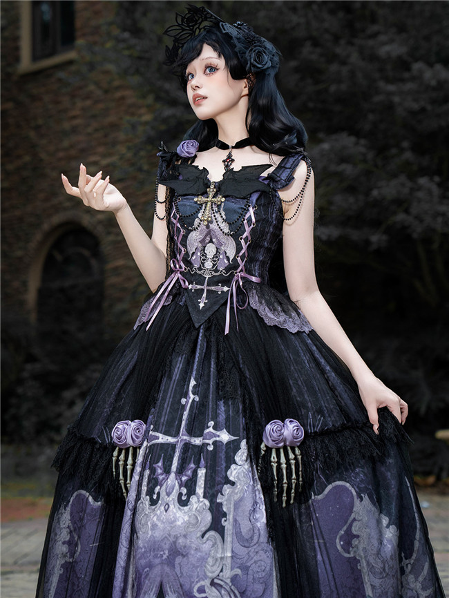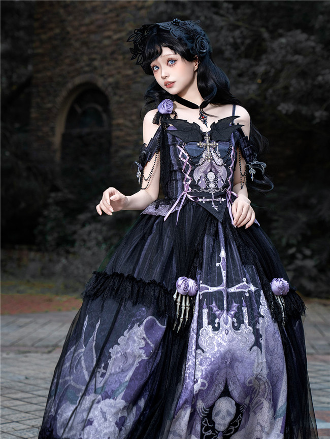This is a black purple dress with skeleton and flowers patterns, back full shirring and adjustable shoulder straps.