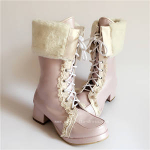 • Product Name: Sweet Pearl Pink Lolita Winter Mid-calf Boots with Beige Lace
