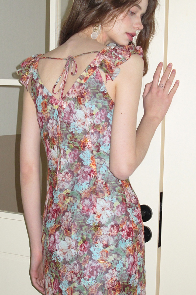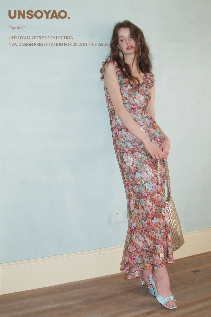 Choose lightweight polyester fabric. Retro red and blue color scheme, ice blue lining design. The U-shaped neckline, ruffed sleeves, and the natural fishtail lines are delicate and slimming.