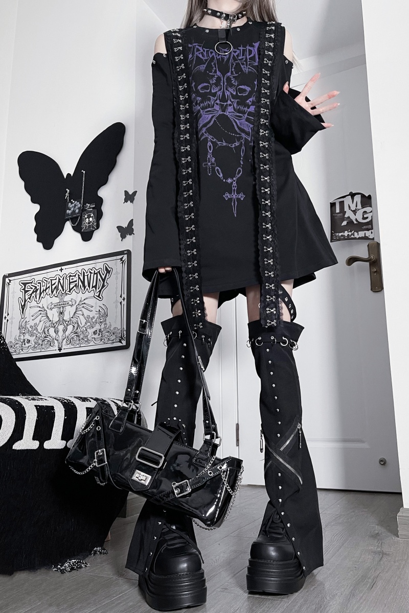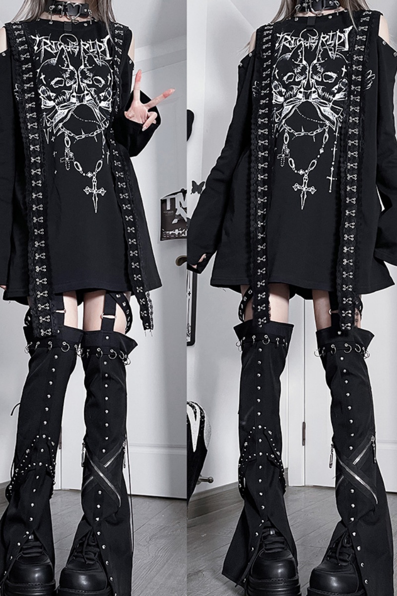 This top adopts the skull and cross prints, and the design of off-shoulder and hanging straps.