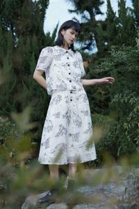 This series features a blouse and skirt adorned with vibrant, artistic bird and flower prints, retro-style buttons, and a gracefully flowing design.