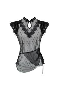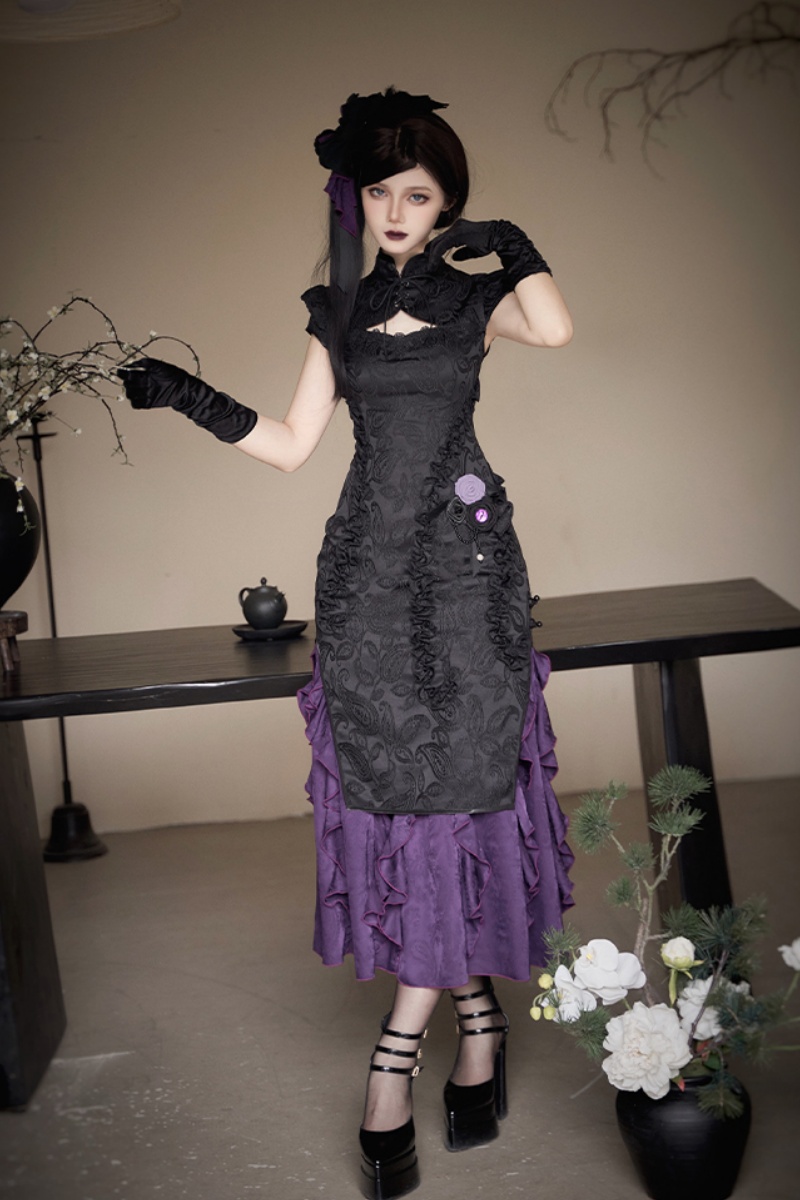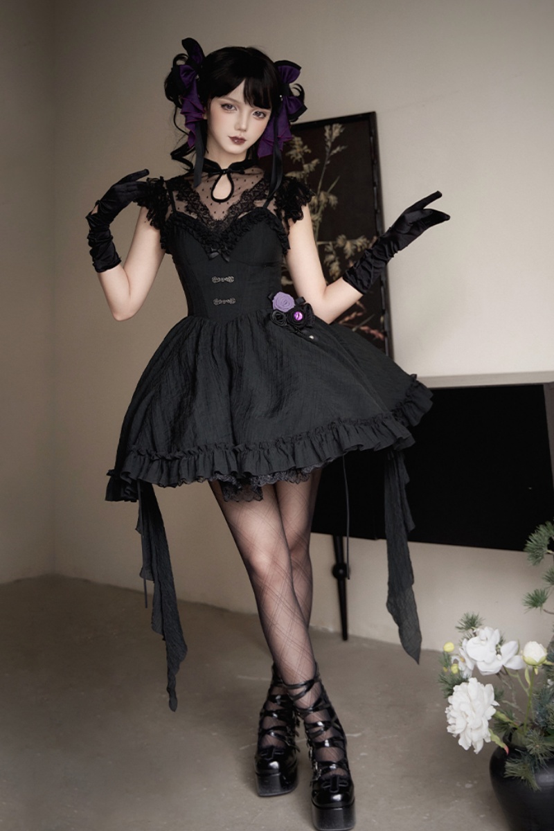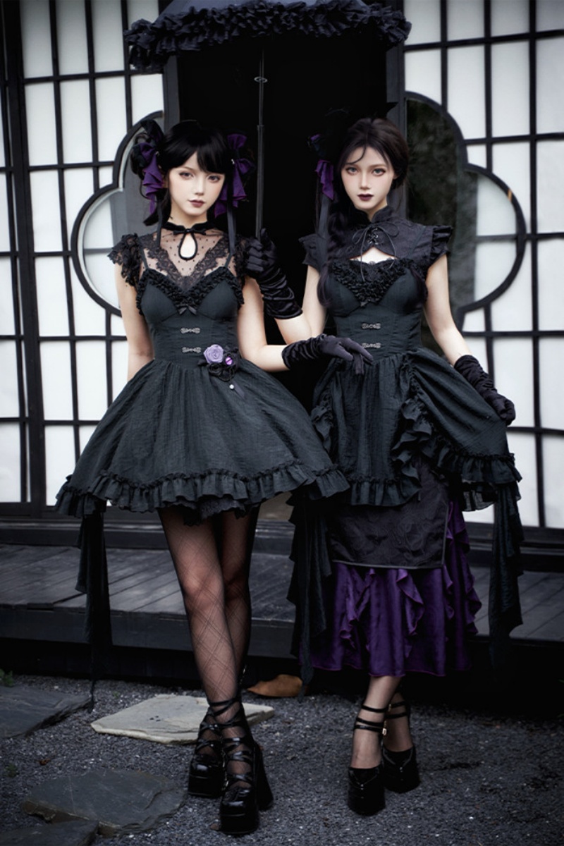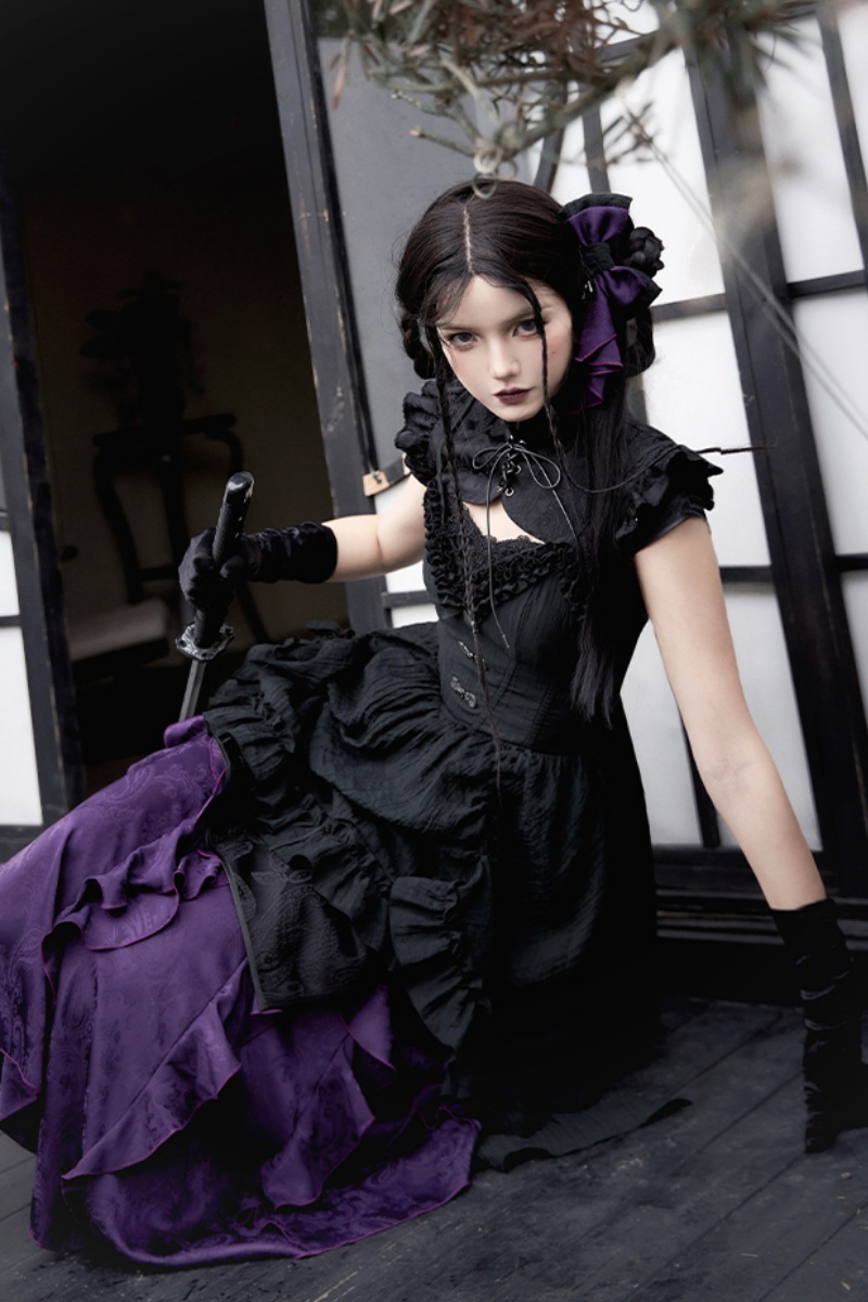 The accessories of the Whirling series are a top, a side clip, and a brooch. The features of Top are irregular layers and drawable straps, multiple and gorgeous lace layers on the chest and shoulders, a hanfu-style button, the eye of the demon decorated with black and purple roses of brooch, and the side clip with wrinkled lace and flowing straps. It is also nice to match a gothic style lolita dress.